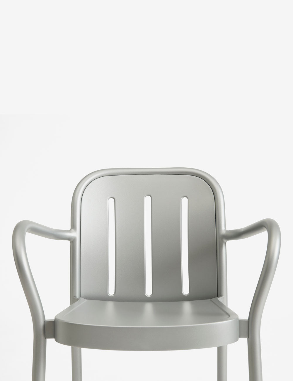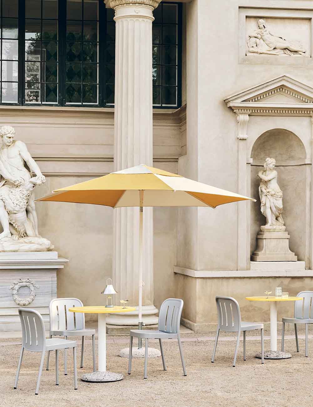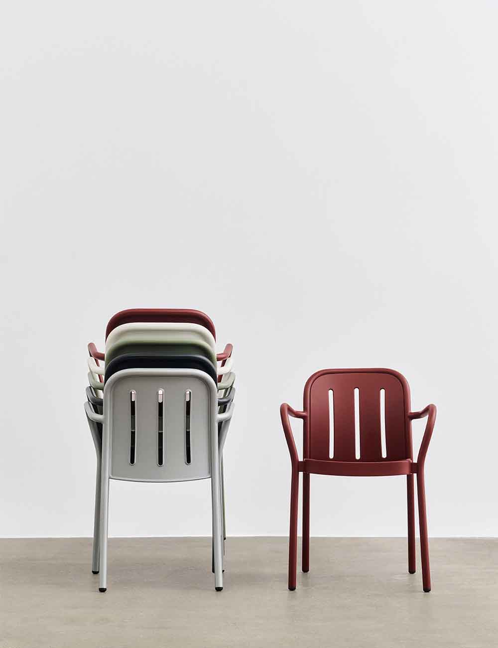 Made from at least 60% post-consumer recycled aluminium, Deville pieces are corrosion-resistant, lightweight and easy to move or rearrange, fitting naturally into balconies, terraces, patios, cafés or gardens. Their stackable design and variety of colours combine practicality with a discreet nostalgic air, making them easy to integrate into any outdoor environment.