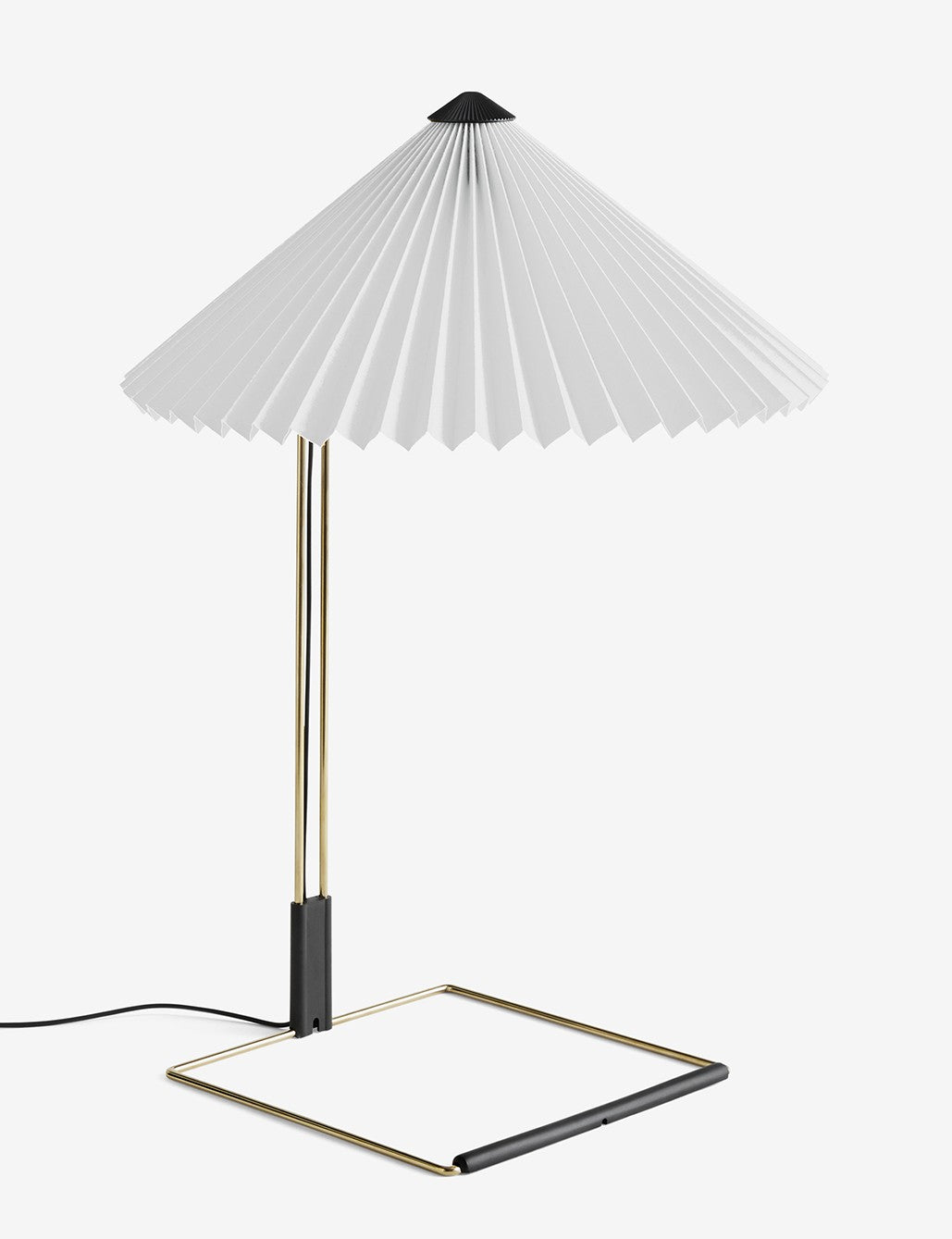 Matin is a table lamp, designed by Inga Sempé for HAY, made of brass with a cotton shade. Matin's delicate design plays with a simple contemporary-style base and a pleated screen with oriental influences, resulting in a sophisticated design lamp with a lot of personality.
