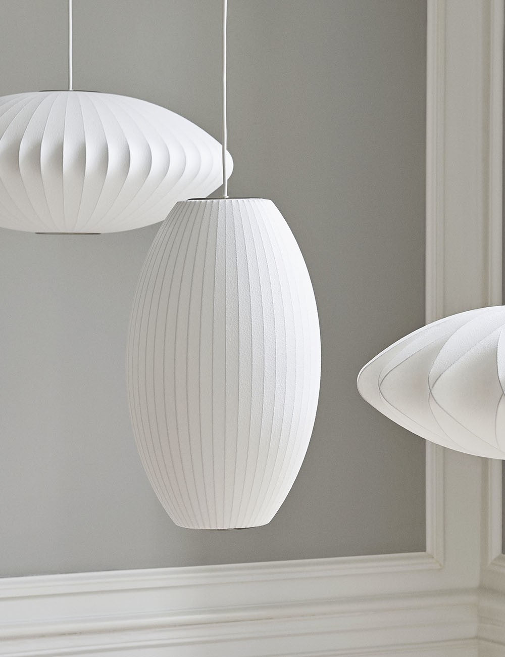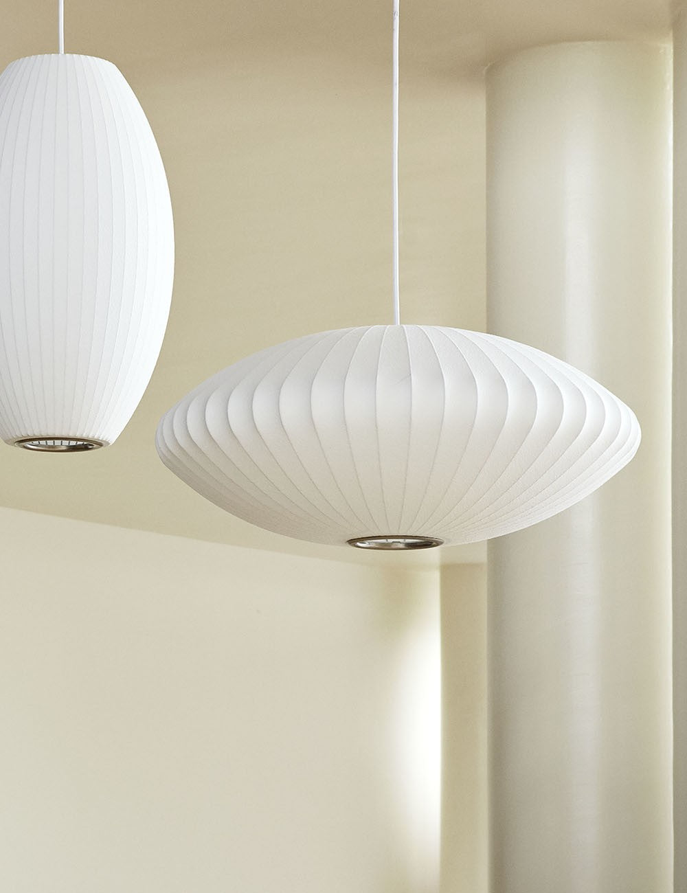 George Nelson managed to create timeless and sophisticated-looking luminaires starting from elementary and spherical shapes such as an apple, a pear or a cigar, and the use of modern materials such as brushed steel and walnut.