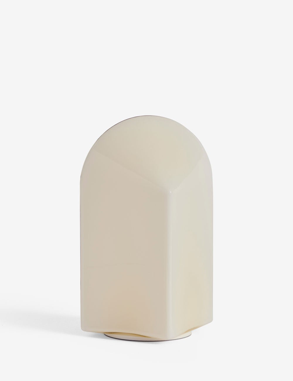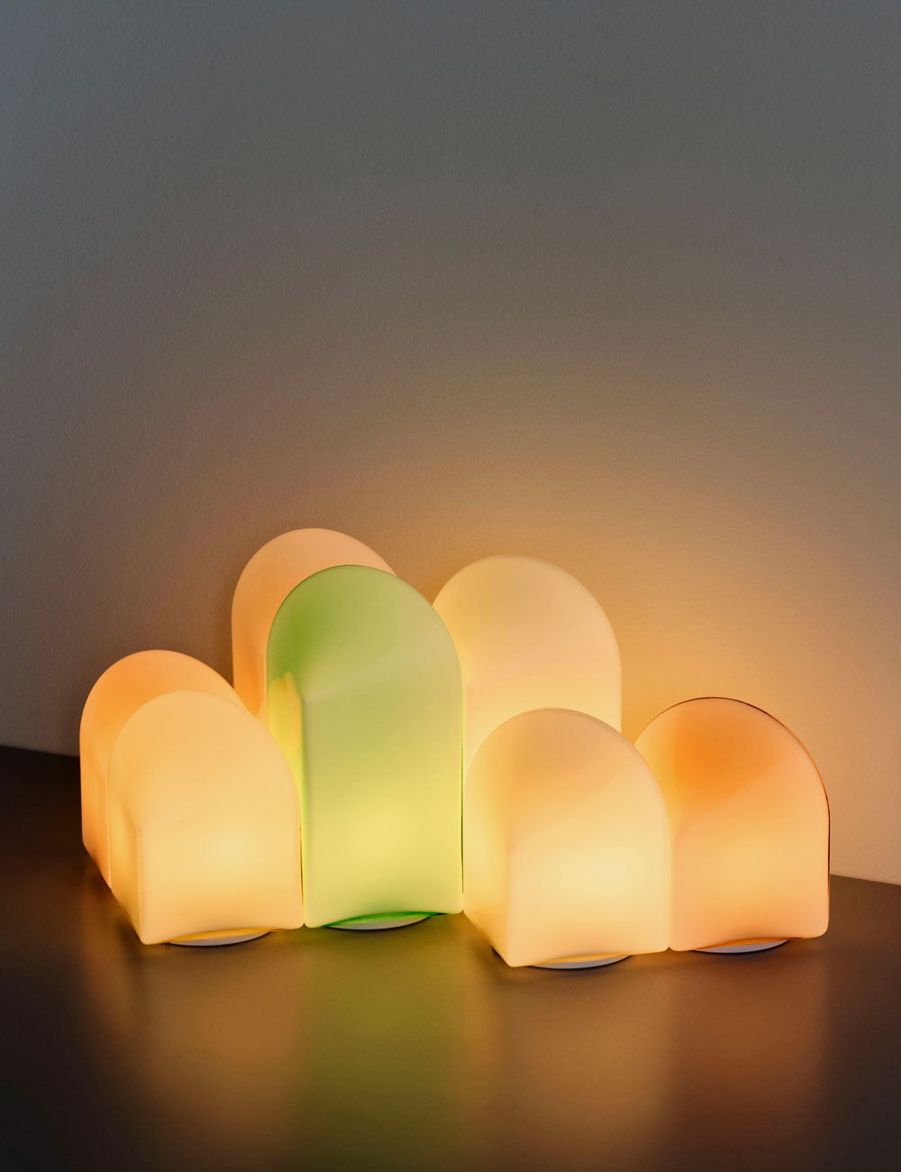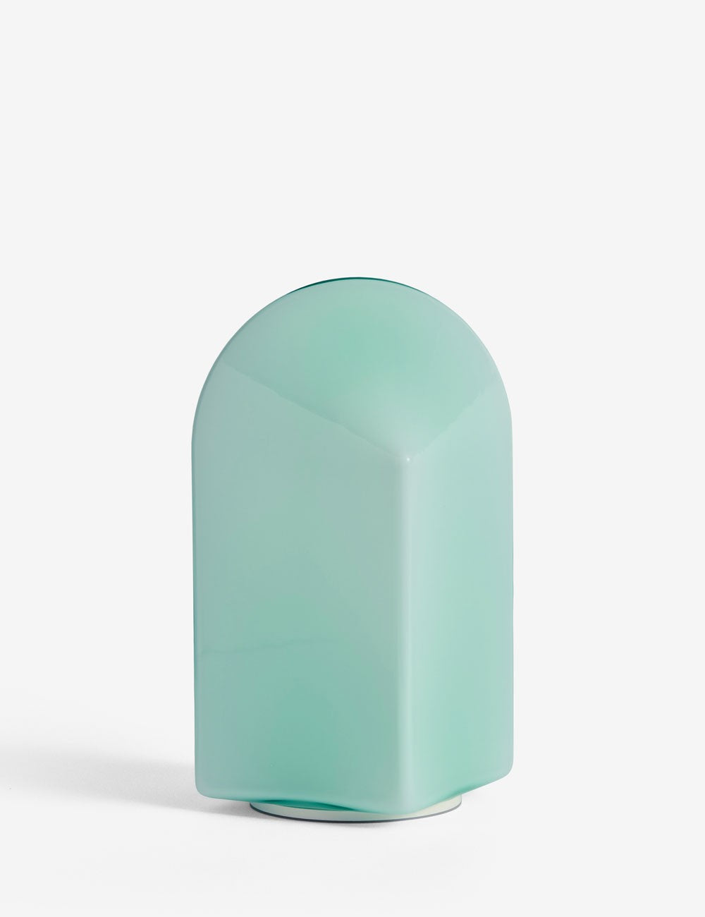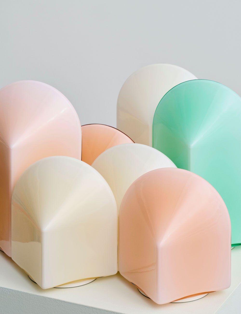 Parade's design is composed of a square base and an arched top of coloured glass, and this geometric shape makes the expression change depending on the angle from which the lamp is viewed.