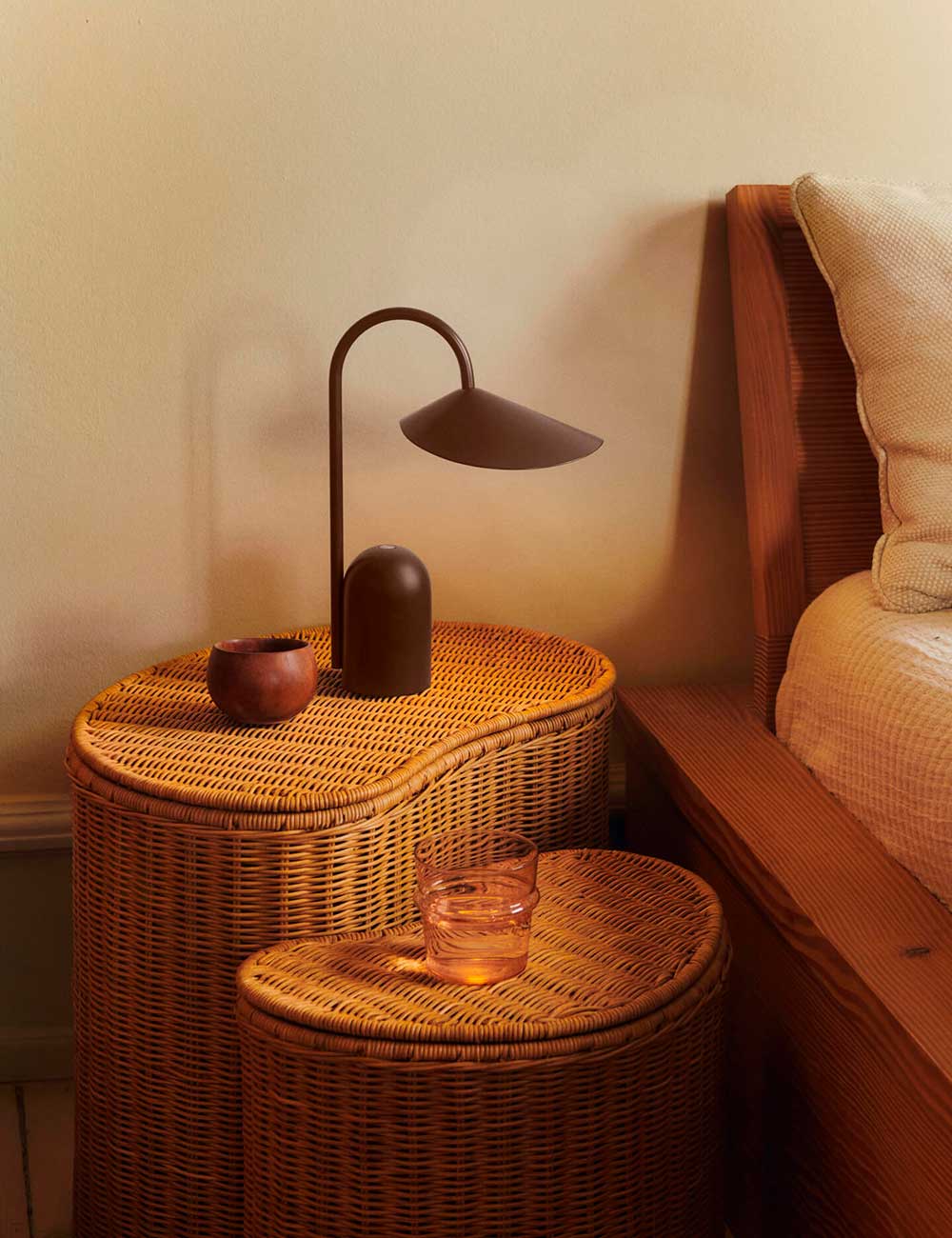 Made from hand-woven rattan on an iron-reinforced frame, this set of two organically shaped units fits perfectly inside each other when not in use.