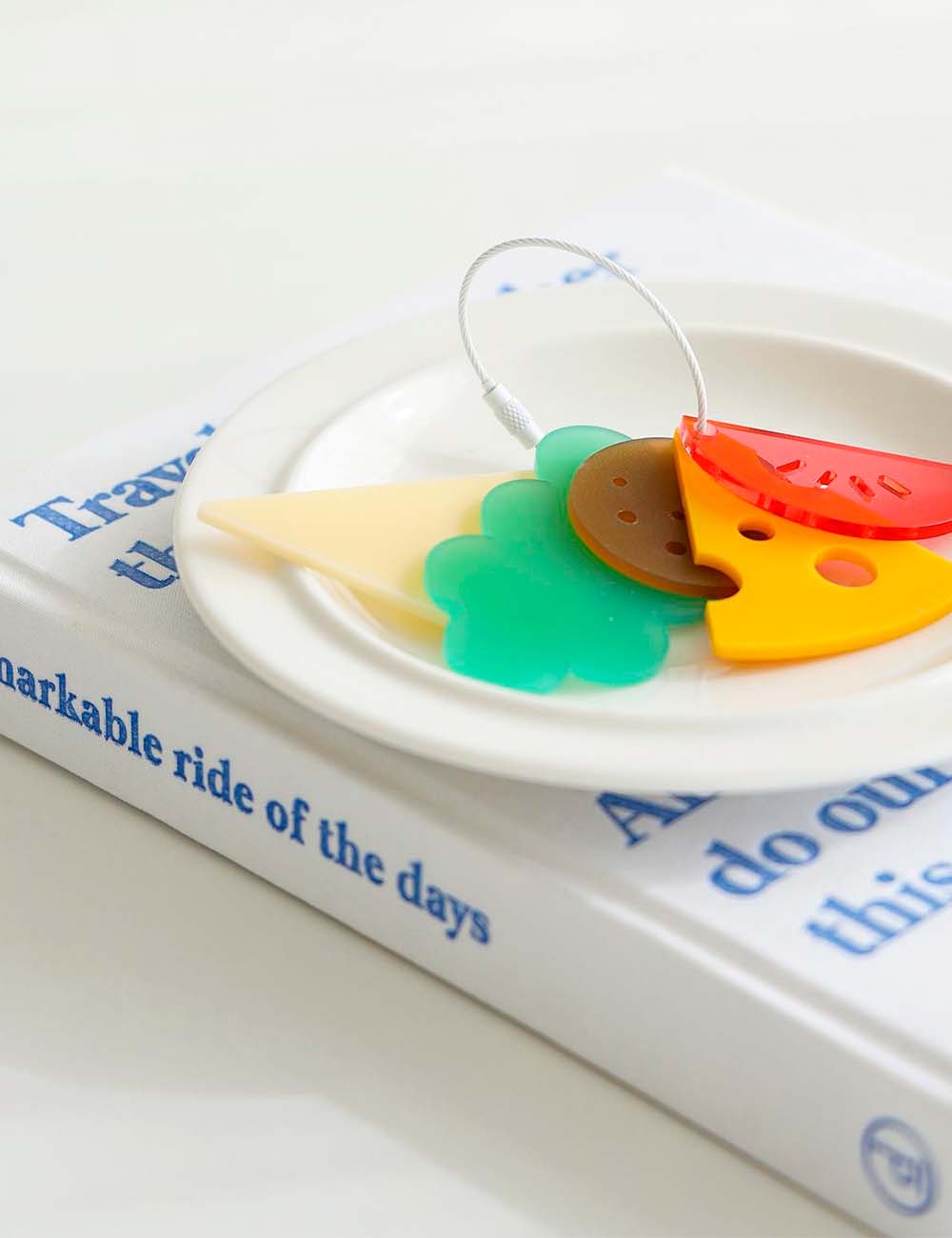Goober Sandwich Acrylic Keyring is an acrylic keyring in the shape of a sandwich, constructed from layers of colourful ingredients: tomato, cheese, ham, lettuce and bread.