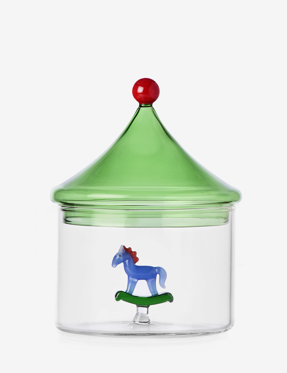 Each piece is handcrafted, combining clear glass with vibrantly coloured figures inside, resulting in functional creations that, at first glance, look like little works of art.