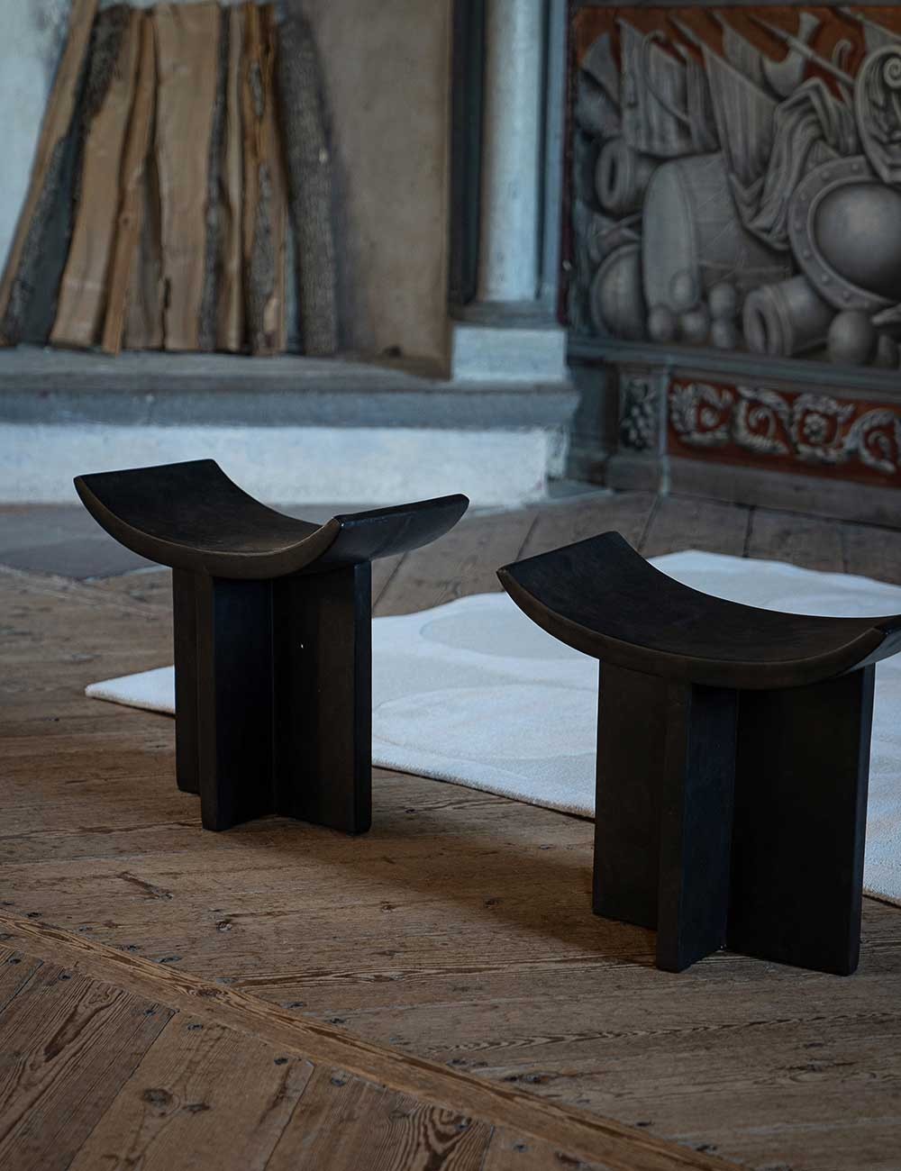 Inspiré des tabourets traditionnels japonais en bois, son assise incurvée et ses pieds croisés distinctifs en font un siège d'appoint idéal autour de la table. Chaque pièce est peinte à la main pour créer une surface texturée unique.