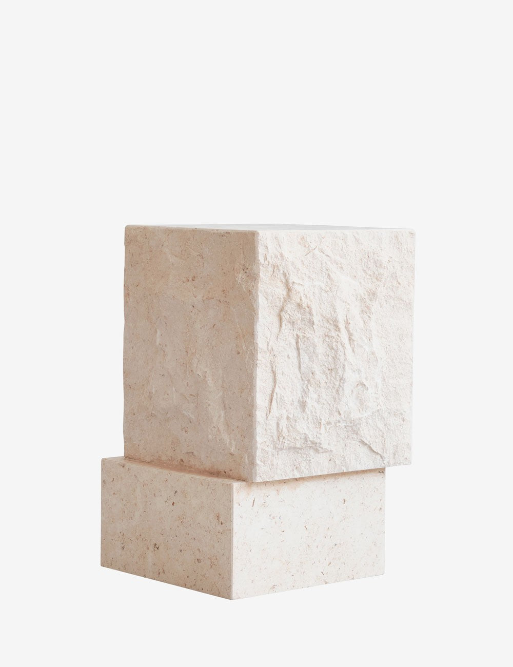 La base Temple à finition lisse est disponible en deux options : calcaire ou métal poli miroir.