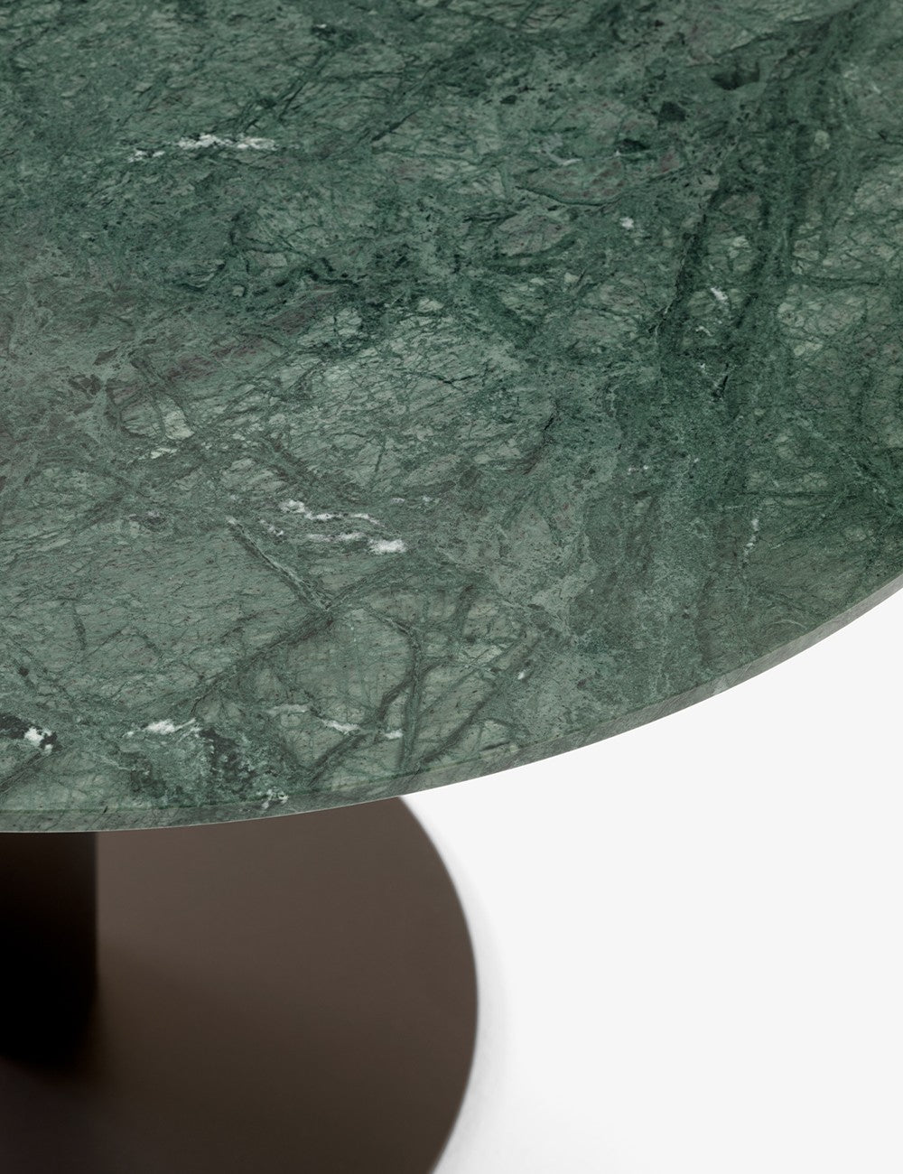 La base tubulaire de la table est en acier noir ou bronzé durable et le plateau est en marbre poli avec une finition mate.