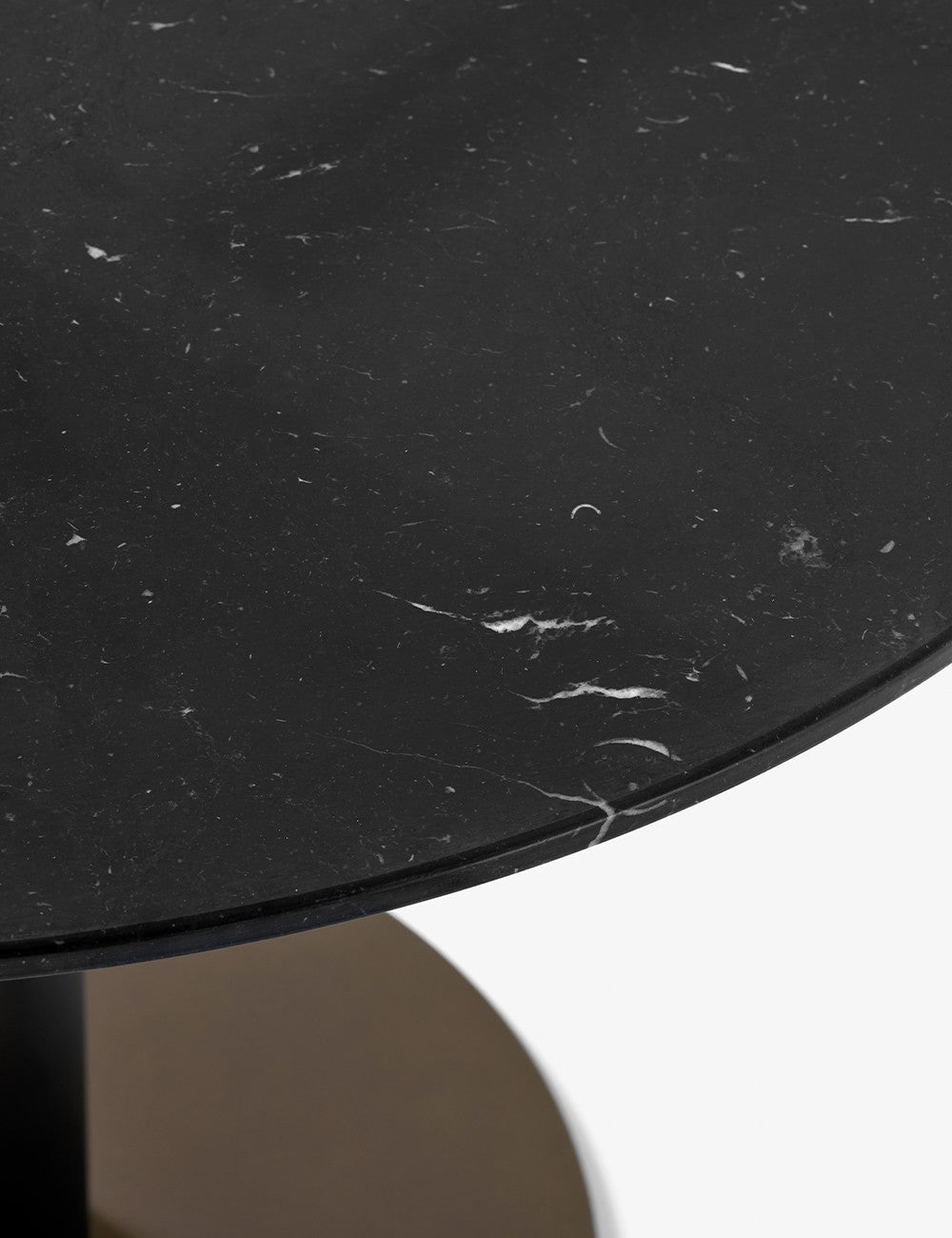La base tubulaire de la table est en acier noir ou bronzé durable et le plateau est en marbre poli avec une finition mate.