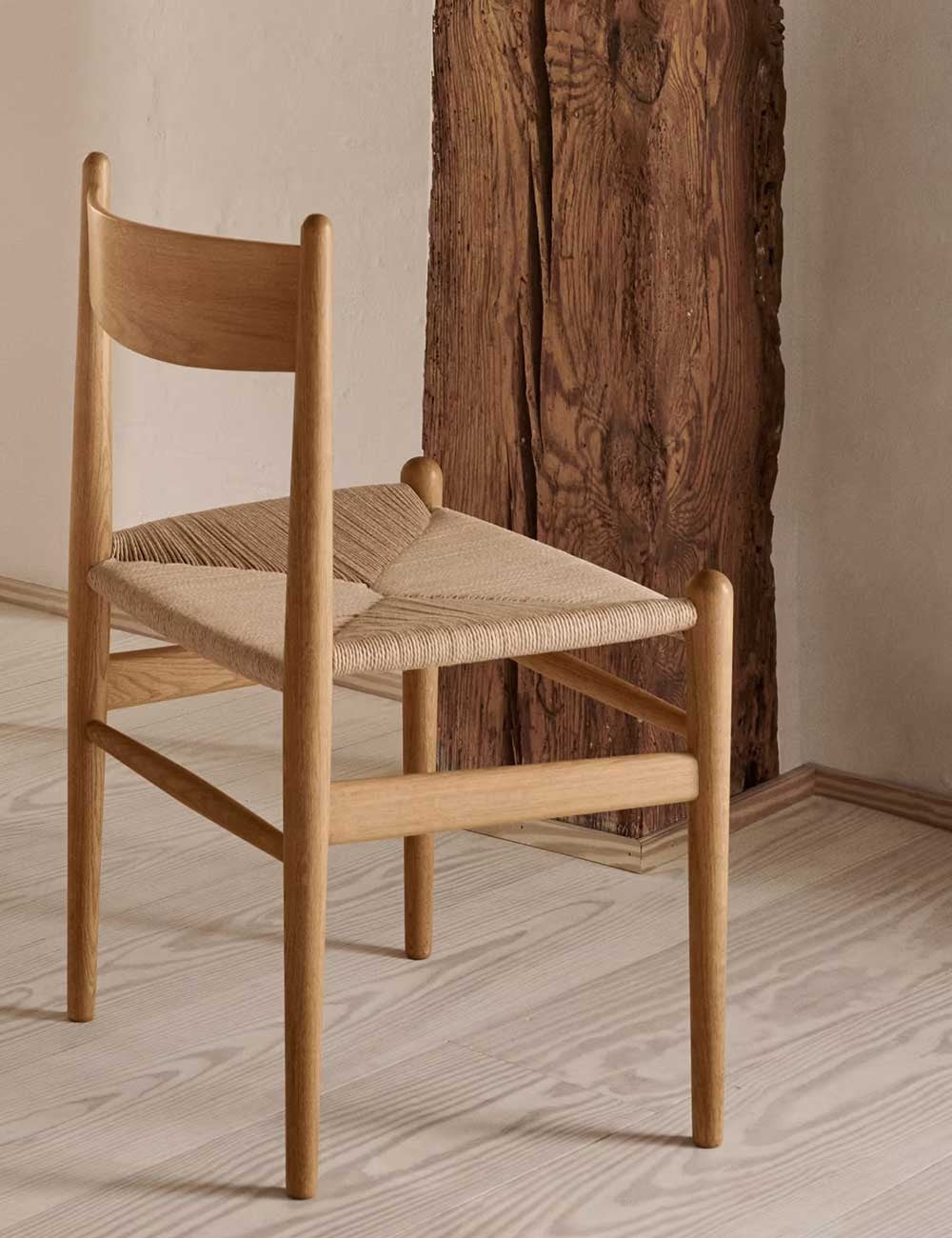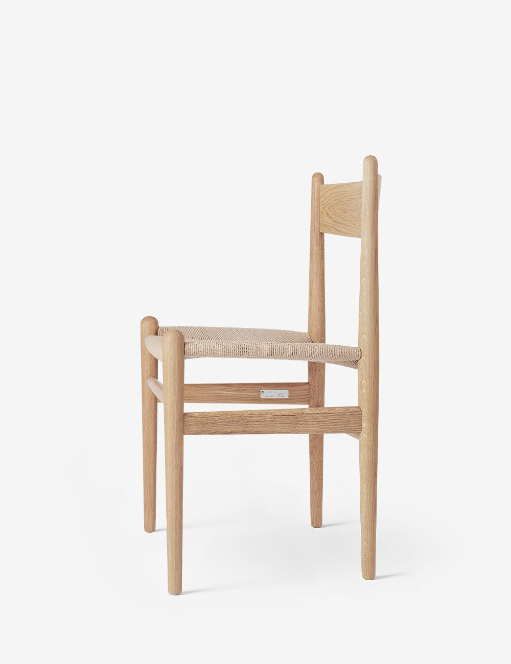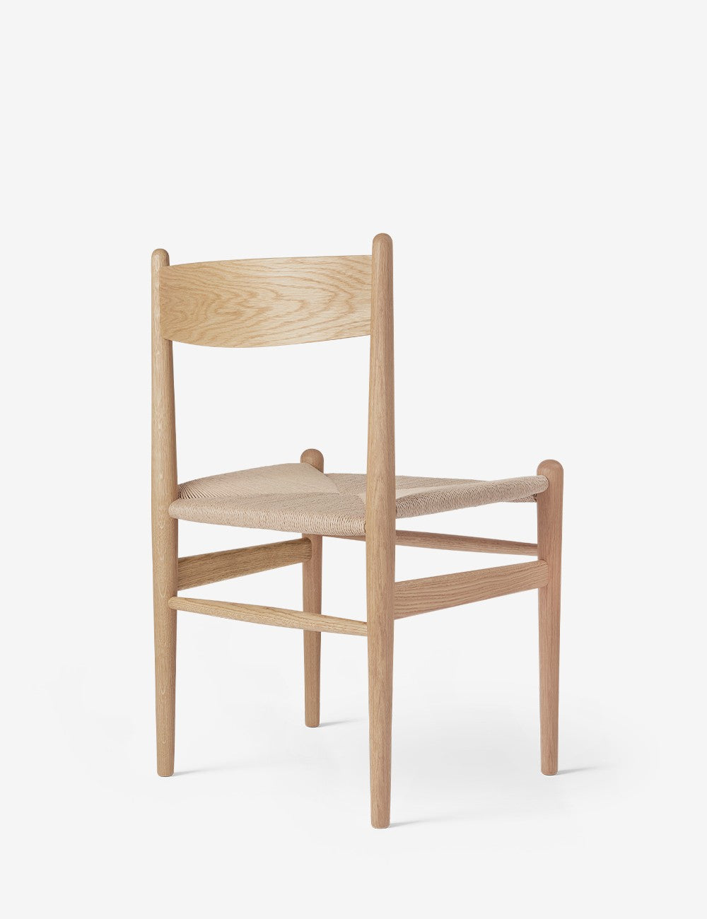 Les pieds du CH36 se rétrécissent légèrement vers le sol, tout comme le dossier, créant ainsi une allure élégante. Le dossier est plus incurvé en haut qu'en bas pour un soutien optimal. L'ensemble est complété par le cadre tissé à la main et l'assise en corde de papier résistante.