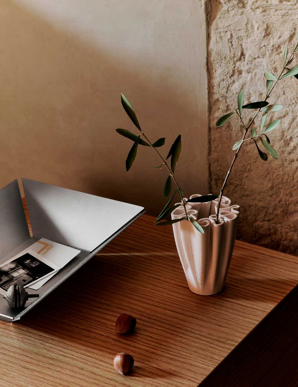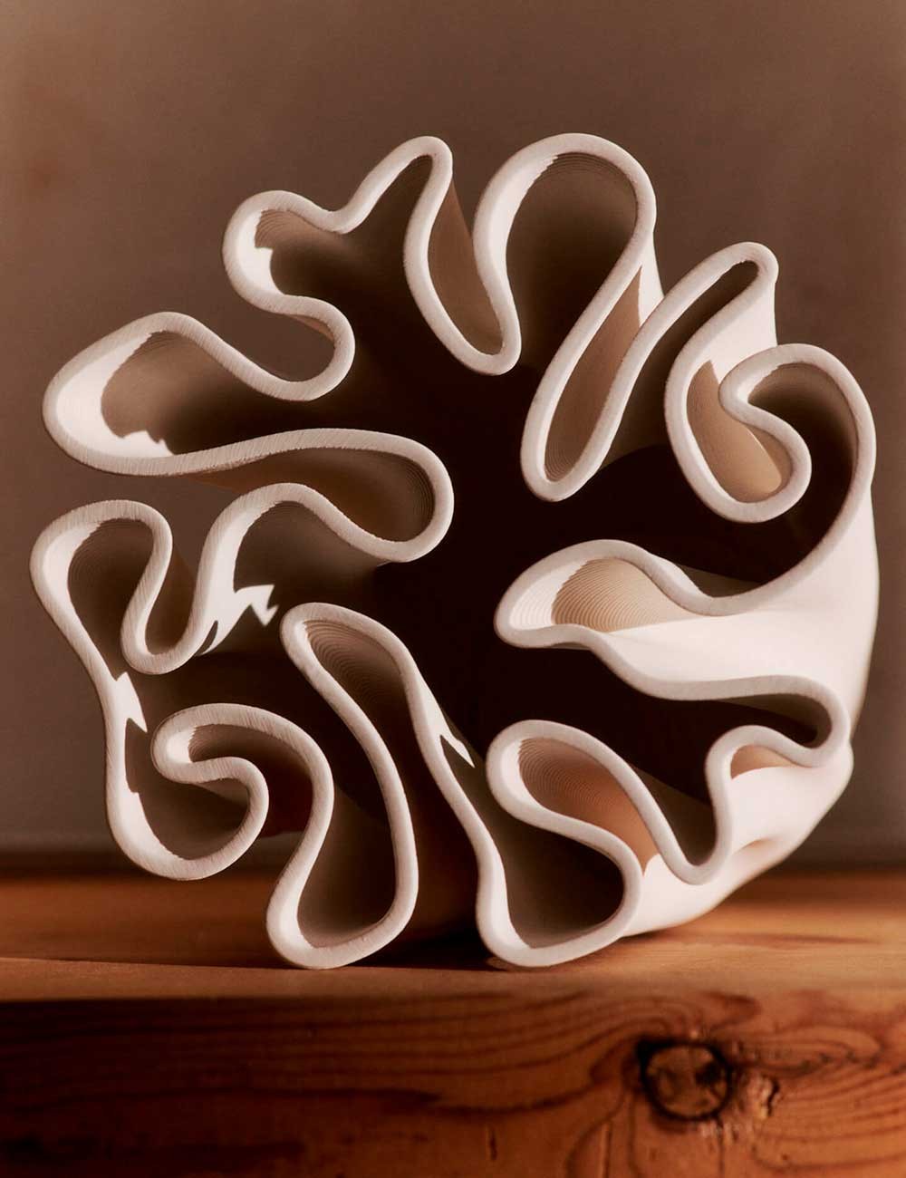 Le Dedali de Ferm Living a été créé à l'aide d'argile d'impression 3D, ce qui a donné lieu à de fines couches qui ont progressivement formé un motif subtil sur le corps du vase, révélant ses origines numériques.