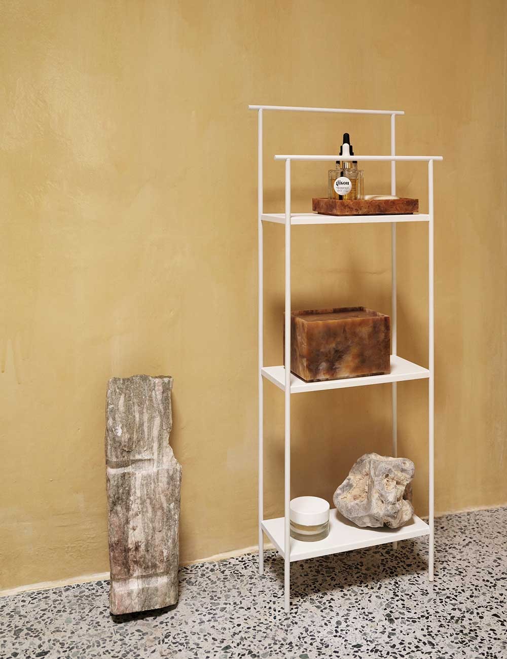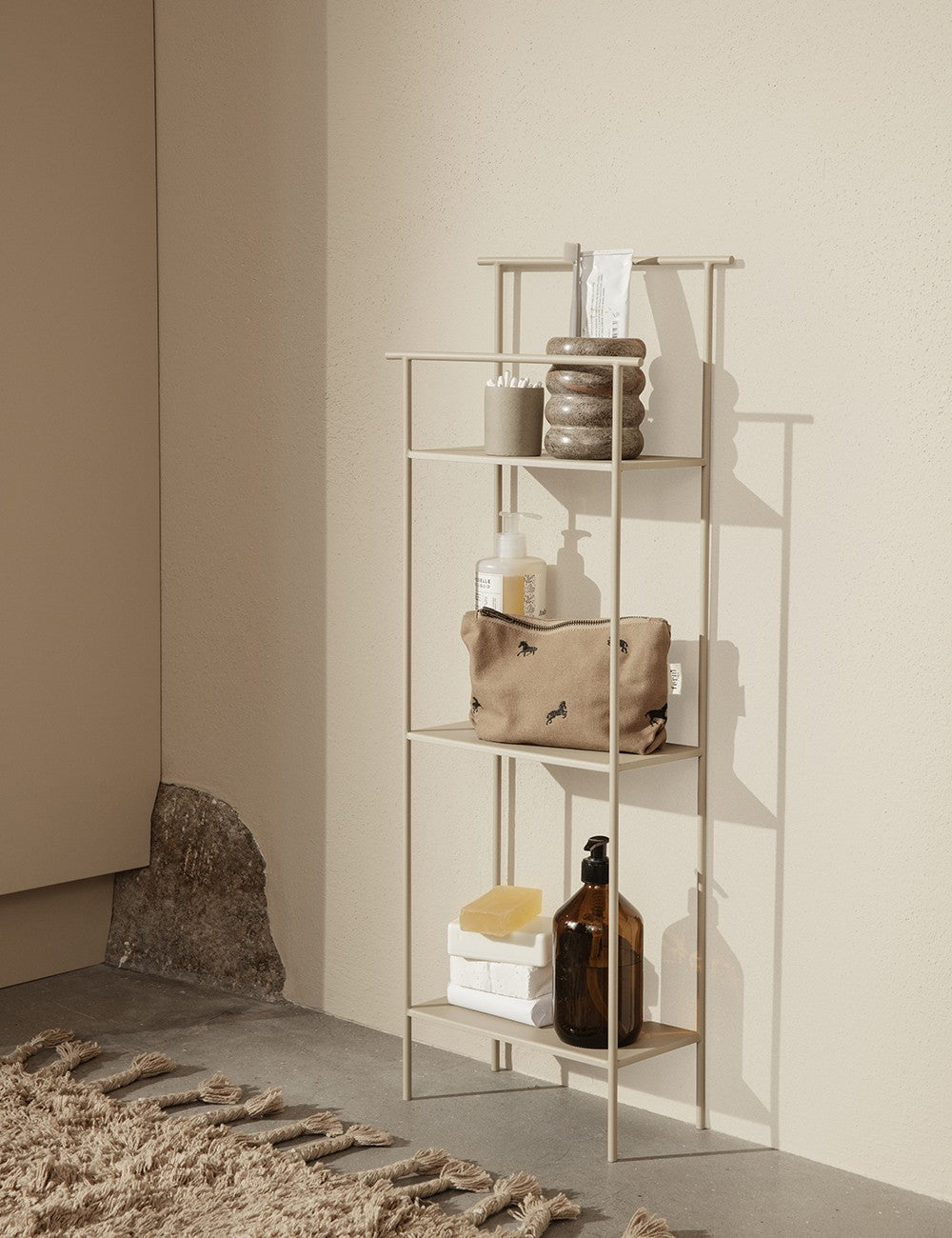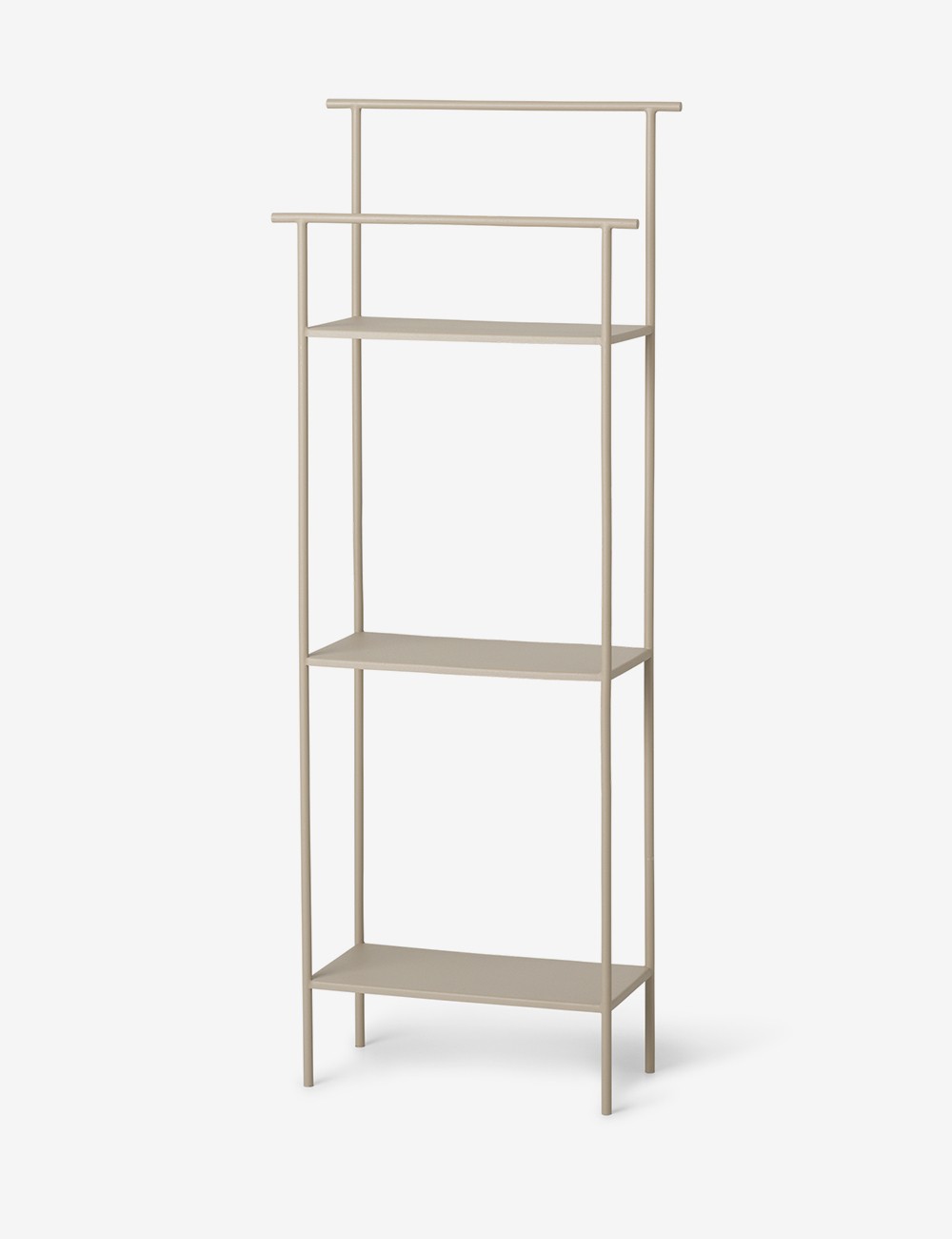 L'étagère de sol Dora est dotée de trois étagères et de deux barres, offrant une solution de rangement parfaite, en particulier pour les petits espaces.