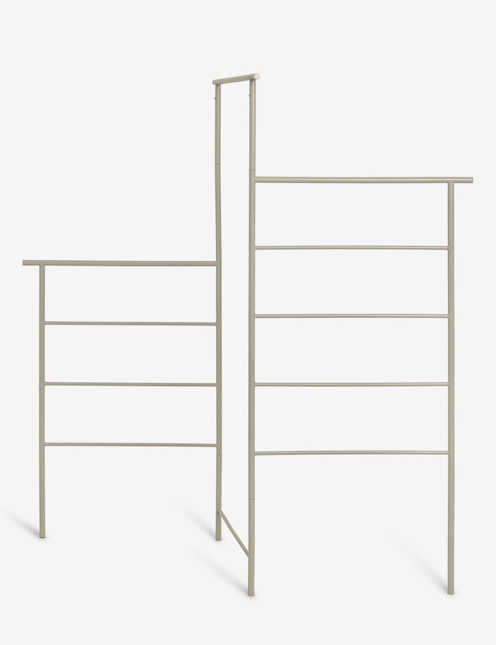Composé de trois pièces de 60 cm à différentes hauteurs : La pièce centrale de 13 cm de haut fait office de support parfait pour y poser des cintres, les pièces latérales de 80 cm et 107 cm sont conçues comme des échelles, parfaites pour servir de porte-serviettes ou pour ranger des vêtements.