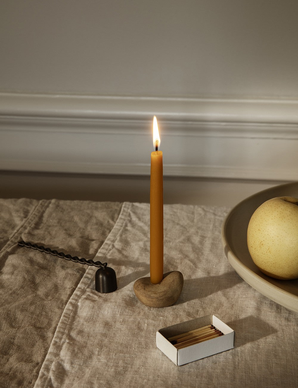 Ce coffret cadeau est livré dans un élégant coffret contenant un bougeoir en céramique, quatre bougies de 1,2 cm de diamètre et un éteignoir en laiton massif.