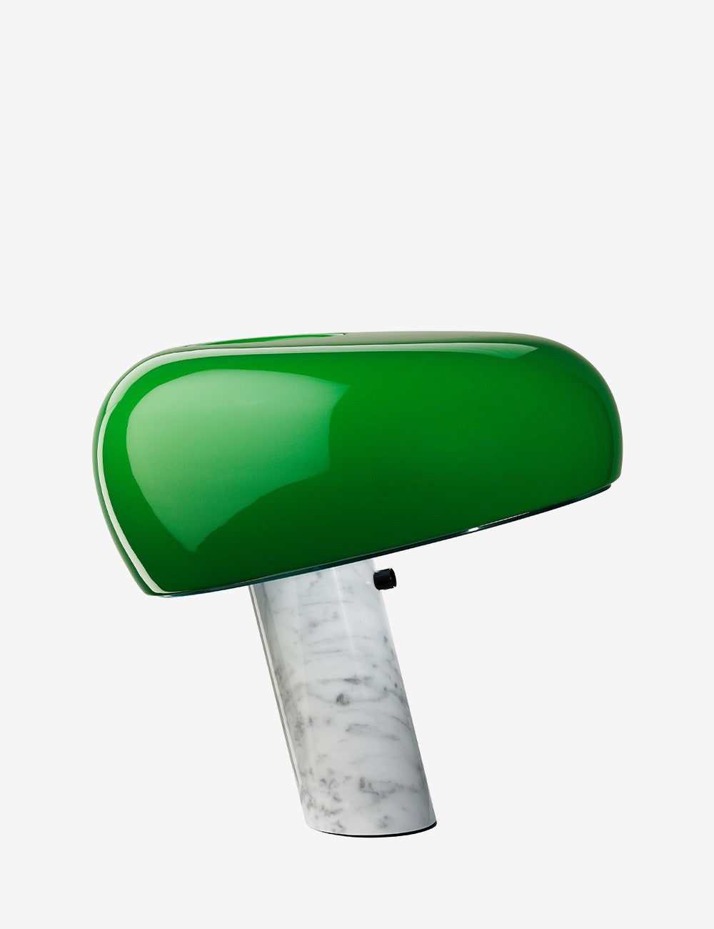 Snoopy combine une base en marbre blanc avec un abat-jour en métal émaillé brillant et un diffuseur en verre épais qui fournit une lumière ambiante agréable.