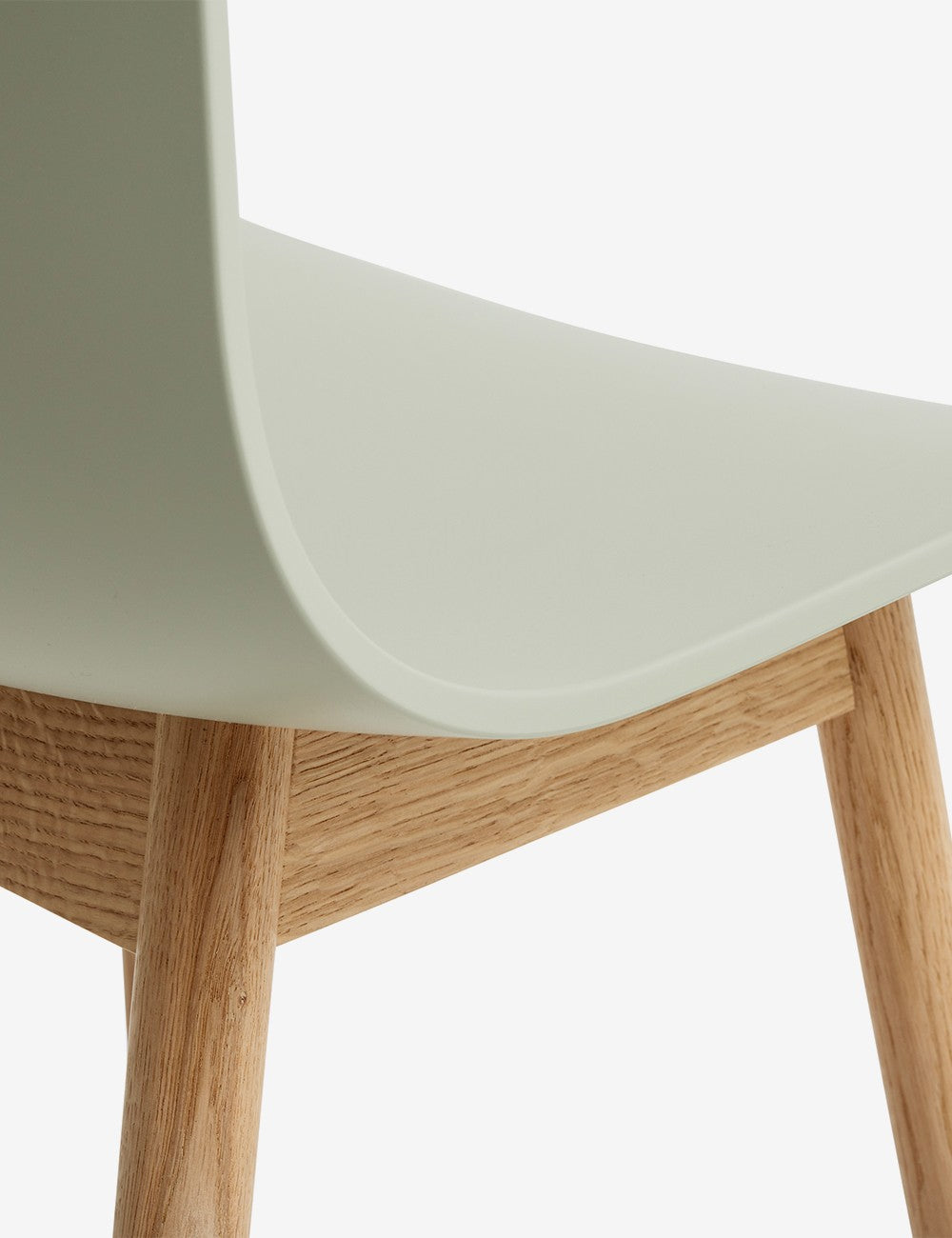 Le siège profilé de la chaise est fabriqué à partir de polypropylène recyclé post-consommation et son cadre en bois est en chêne ou en noyer et fini avec une laque à base d'eau respectueuse de l'environnement.