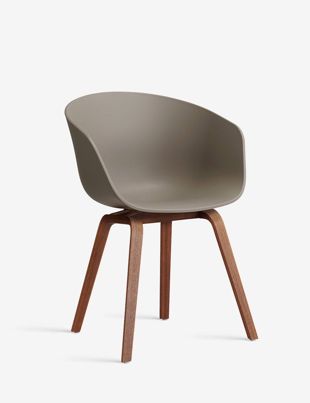 Le siège profilé de la chaise est fabriqué à partir de polypropylène recyclé post-consommation et son cadre en bois est en chêne ou en noyer et fini avec une laque à base d'eau respectueuse de l'environnement.