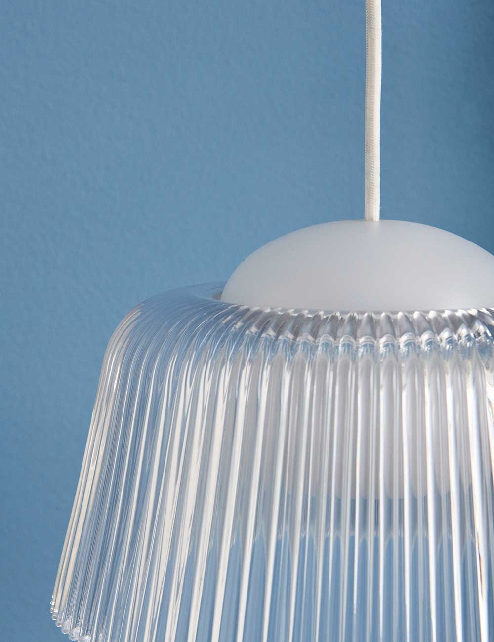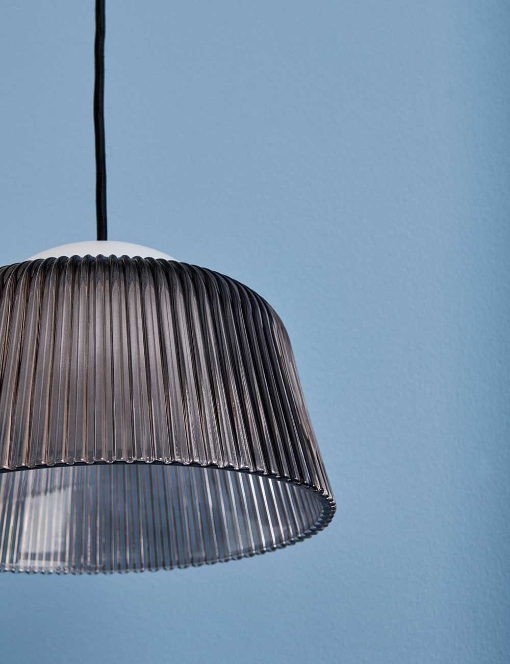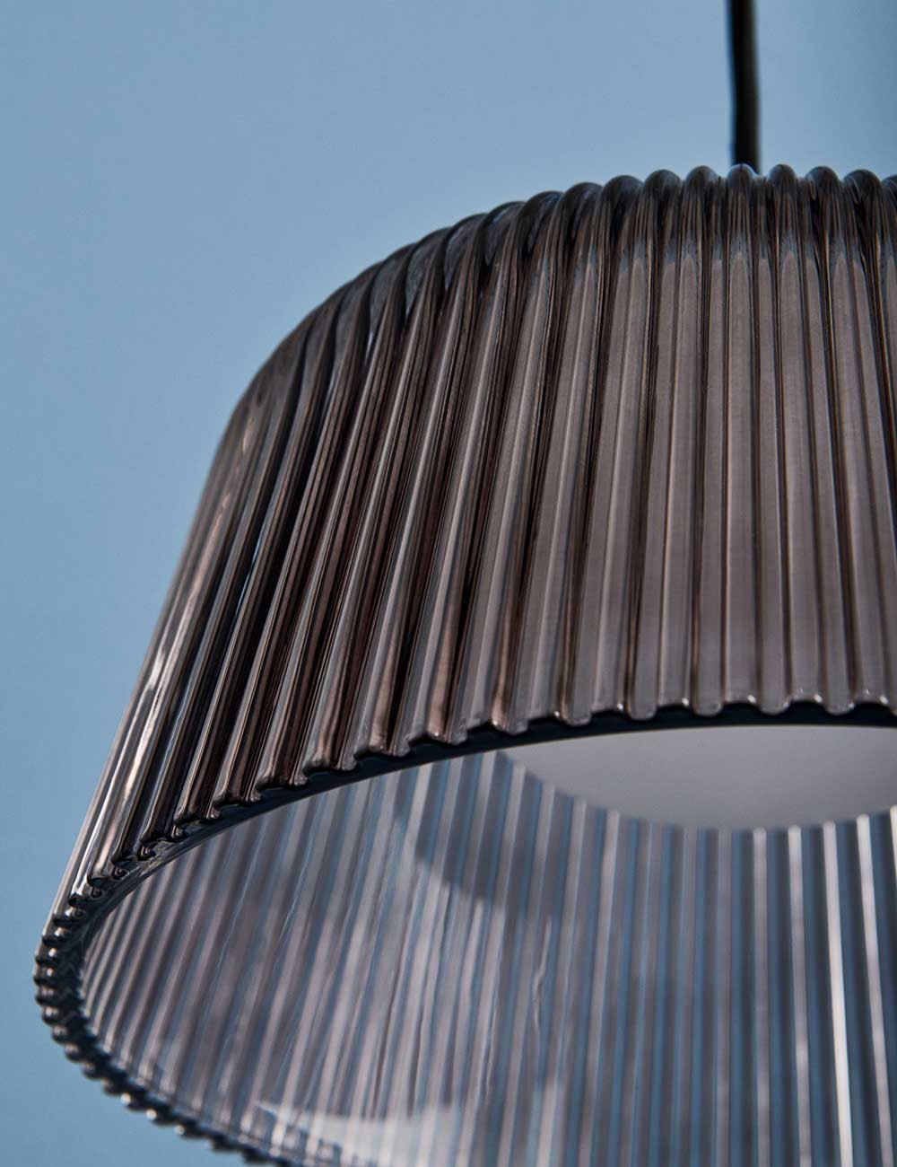 La sphère intérieure de Brim dissimule les ampoules, qui sont entourées d'un abat-jour en verre cannelé distinctif qui améliore la diffusion de la lumière.