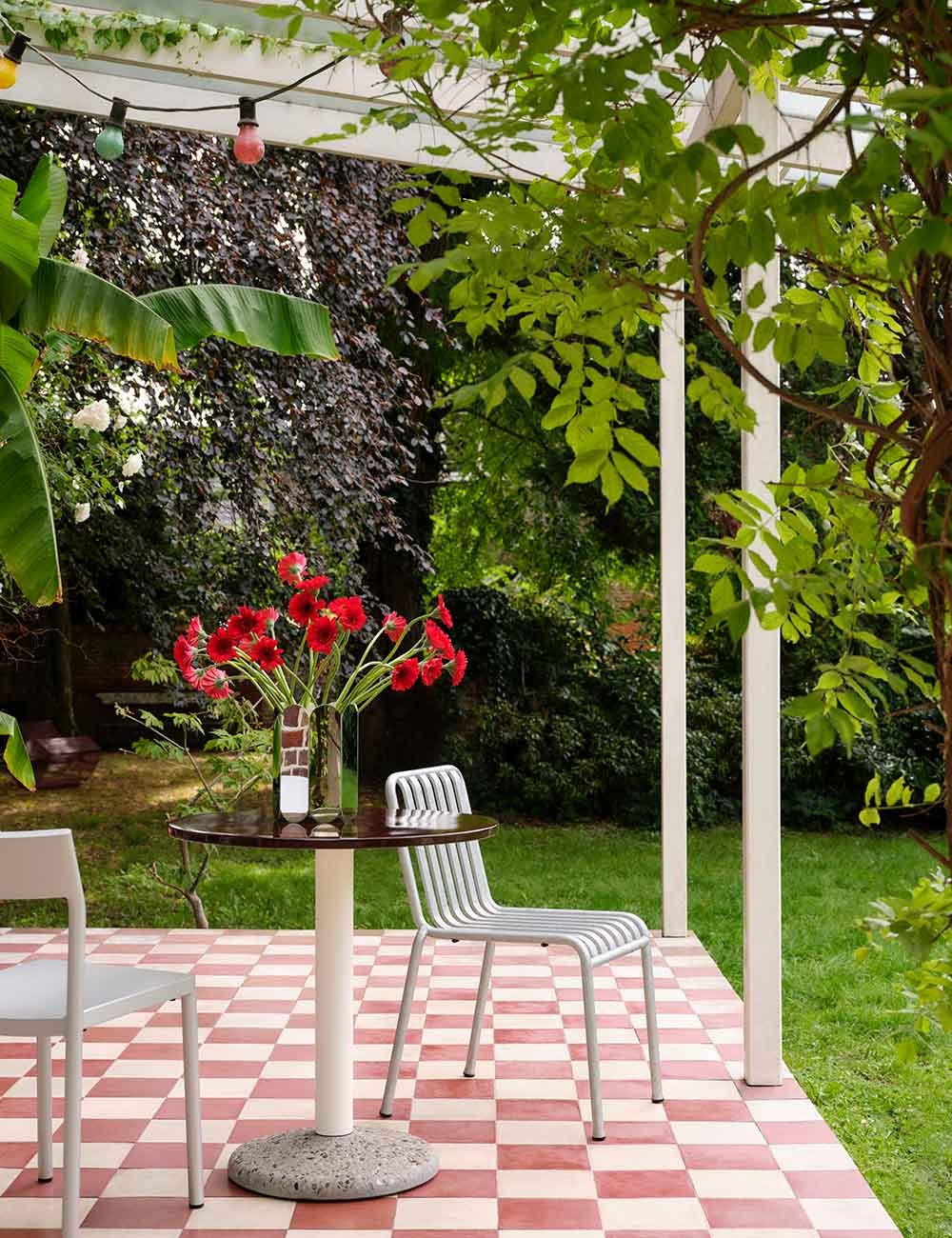 Cette table d'extérieur colorée est composée d'un plateau en porcelaine, d'un tube en acier et d'une base en béton.