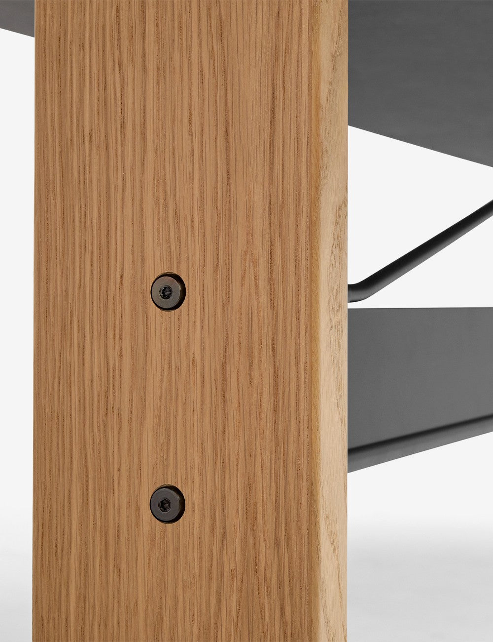 Le plateau est doté de bords en bois massif et d'une surface plaquée. Le cadre de la table est tout aussi robuste et fonctionnel, avec une structure en bois massif et une traverse en aluminium et en acier qui renforce et stabilise la table.
