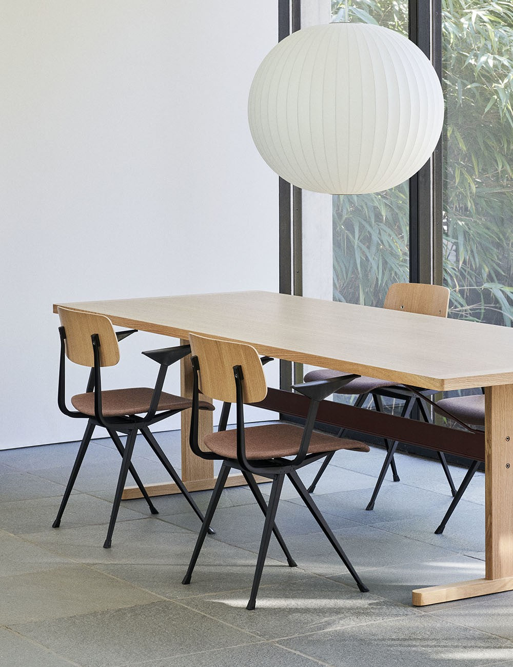 La chaise Result est dotée d'un piètement fin en tôle d'acier et d'une assise et d'un dossier en chêne, garantissant une flexibilité, une légèreté et une résistance maximales tout en conservant son design minimaliste. Initialement très appréciée dans les écoles des années 1950, son esthétique épurée et sa durabilité lui permettent d'être utilisée dans de nombreux environnements publics et privés. Disponible dans une variété de finitions de bois et de couleurs de piètement, elle s'harmonise avec la table Pyramid.
