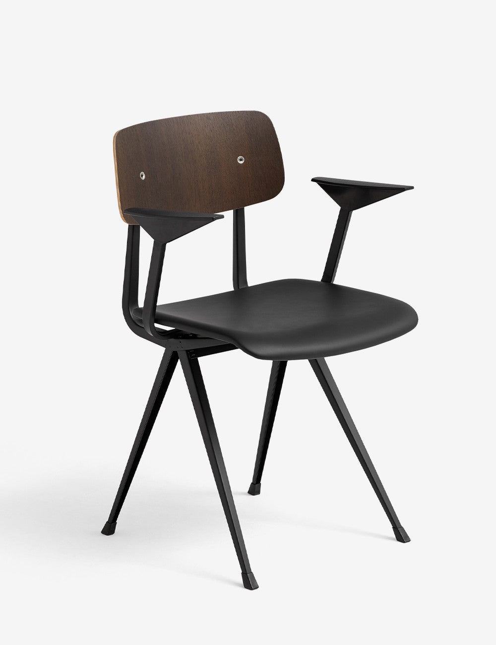 La chaise Result est dotée d'un piètement fin en tôle d'acier et d'une assise et d'un dossier en chêne, garantissant une flexibilité, une légèreté et une résistance maximales tout en conservant son design minimaliste. Initialement très appréciée dans les écoles des années 1950, son esthétique épurée et sa durabilité lui permettent d'être utilisée dans de nombreux environnements publics et privés. Disponible dans une variété de finitions de bois et de couleurs de piètement, elle s'harmonise avec la table Pyramid.