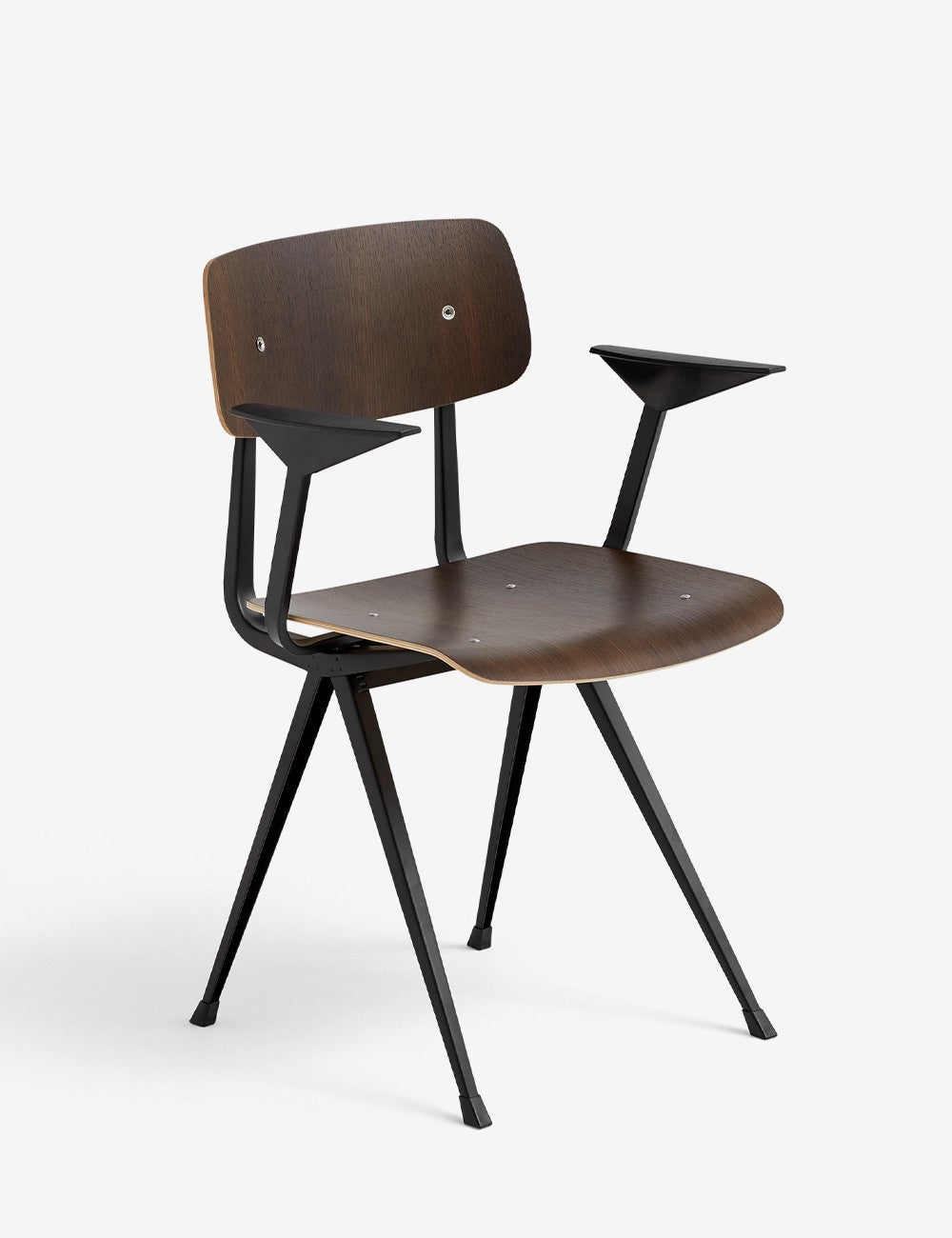 La chaise Result est dotée d'un piètement fin en tôle d'acier et d'une assise et d'un dossier en chêne, garantissant une flexibilité, une légèreté et une résistance maximales tout en conservant son design minimaliste. Initialement très appréciée dans les écoles des années 1950, son esthétique épurée et sa durabilité lui permettent d'être utilisée dans de nombreux environnements publics et privés. Disponible dans une variété de finitions de bois et de couleurs de piètement, elle s'harmonise avec la table Pyramid.