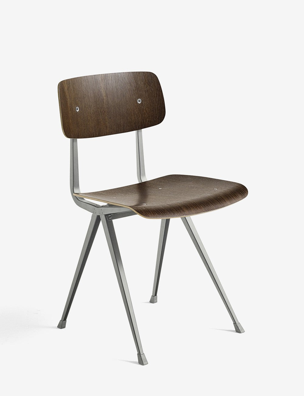 La chaise Result est dotée d'un piètement fin en tôle d'acier et d'une assise et d'un dossier en chêne, garantissant une flexibilité, une légèreté et une résistance maximales tout en conservant son design minimaliste. Initialement très appréciée dans les écoles des années 1950, son esthétique épurée et sa durabilité lui permettent d'être utilisée dans de nombreux environnements publics et privés. Disponible dans une variété de finitions de bois et de couleurs de piètement, elle s'harmonise avec la table Pyramid.