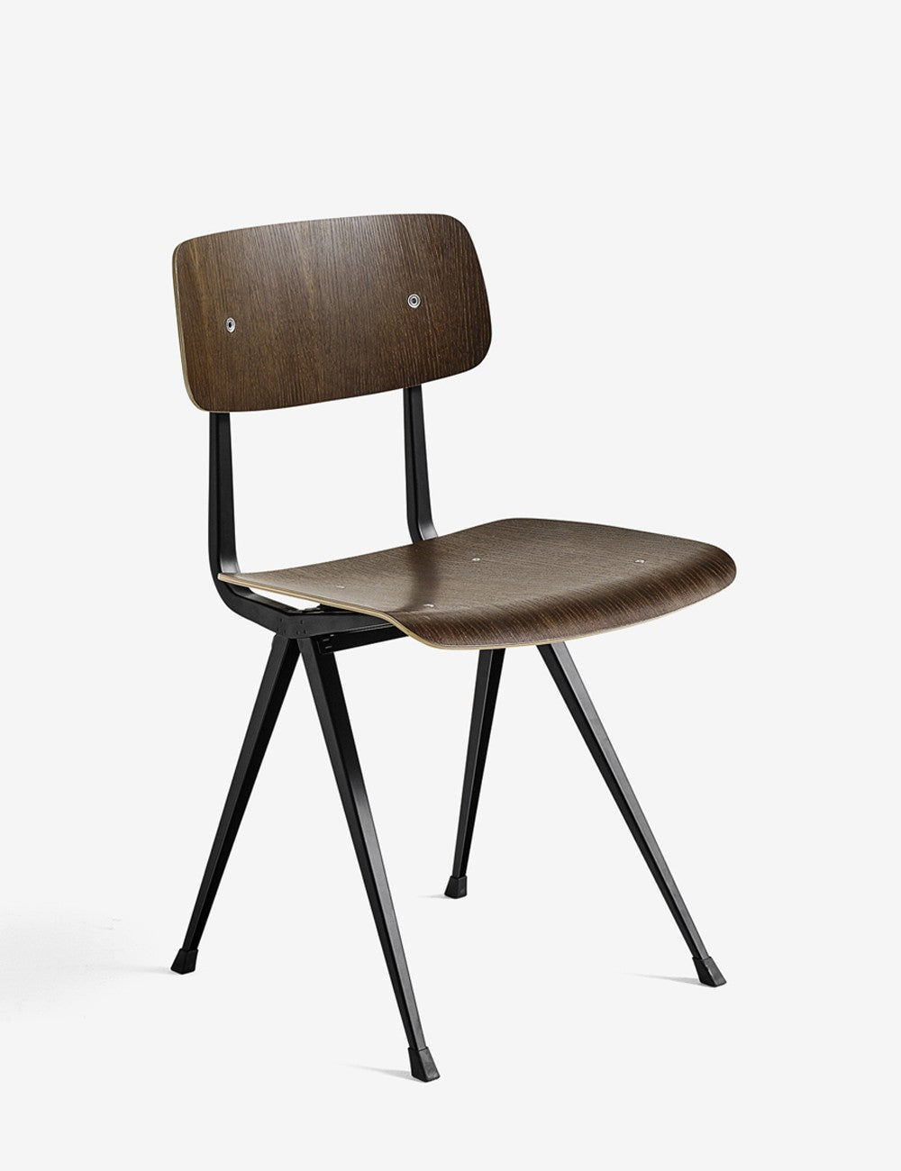 La chaise Result est dotée d'un piètement fin en tôle d'acier et d'une assise et d'un dossier en chêne, garantissant une flexibilité, une légèreté et une résistance maximales tout en conservant son design minimaliste. Initialement très appréciée dans les écoles des années 1950, son esthétique épurée et sa durabilité lui permettent d'être utilisée dans de nombreux environnements publics et privés. Disponible dans une variété de finitions de bois et de couleurs de piètement, elle s'harmonise avec la table Pyramid.