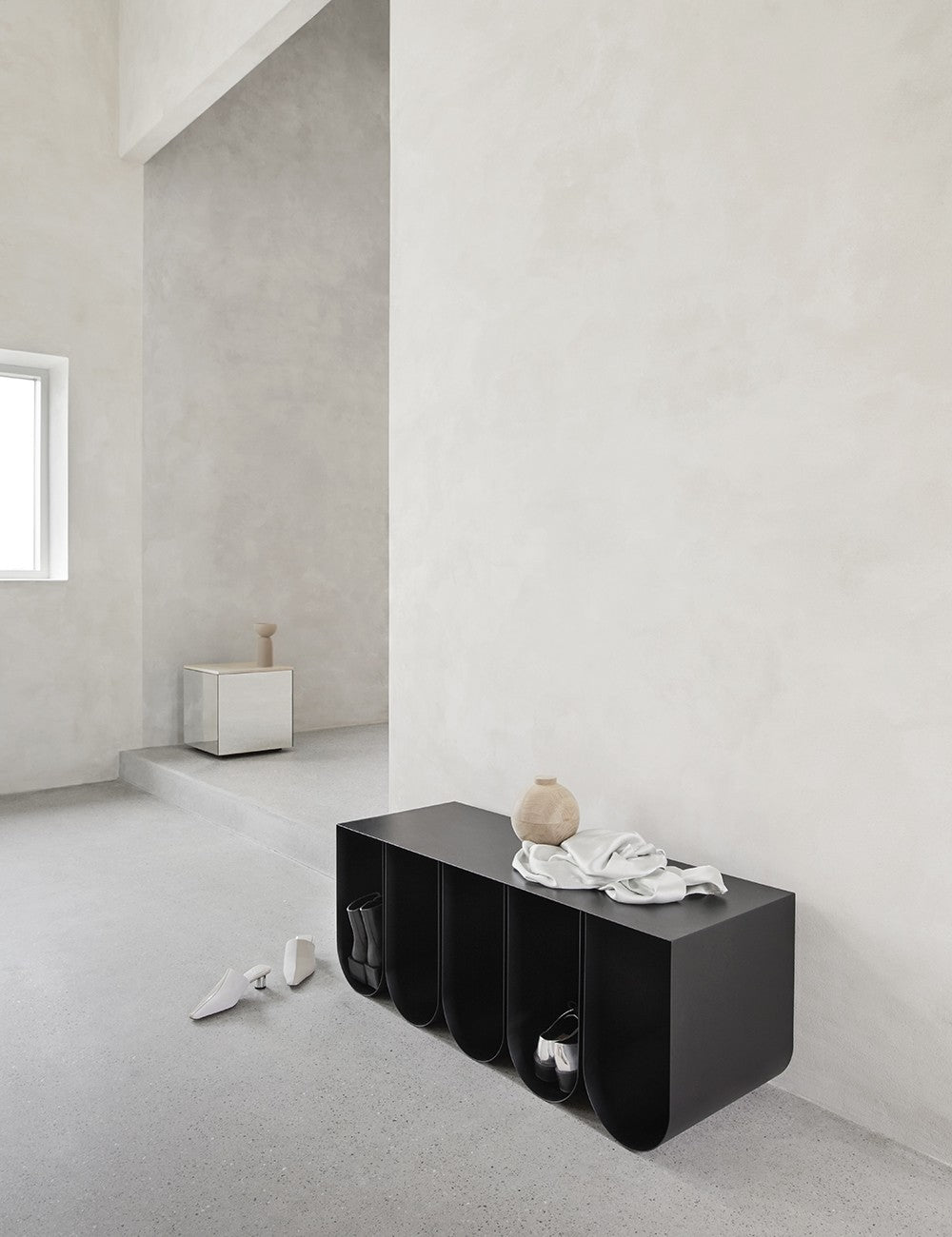 La série Curved de Kristina Dam est une série de tables et de bancs de style minimaliste en acier.