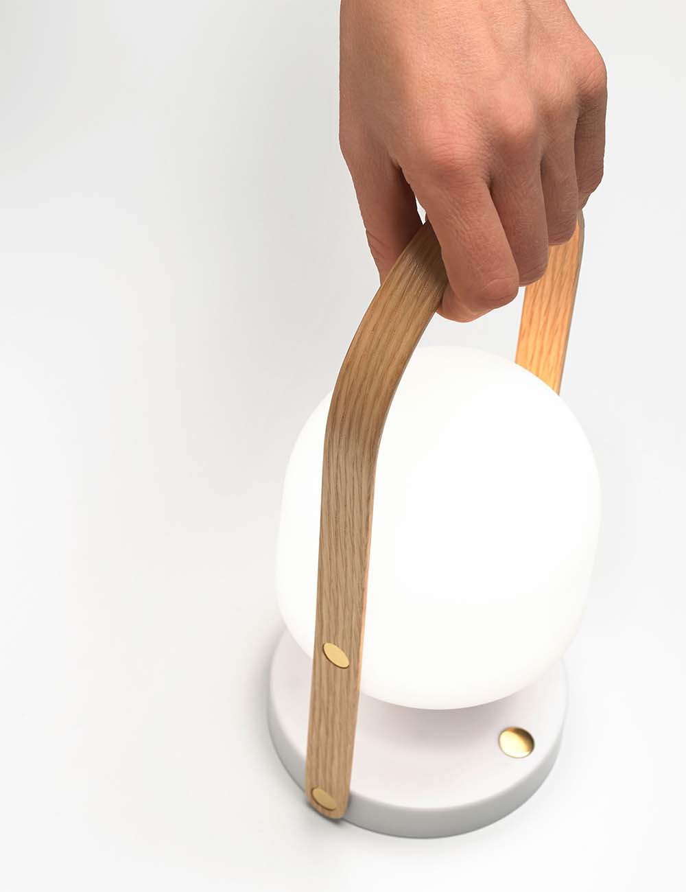 La poignée en chêne facilite son transport, tandis que son abat-jour inclinable en polycarbonate blanc fournit également une lumière directe pour la lecture.