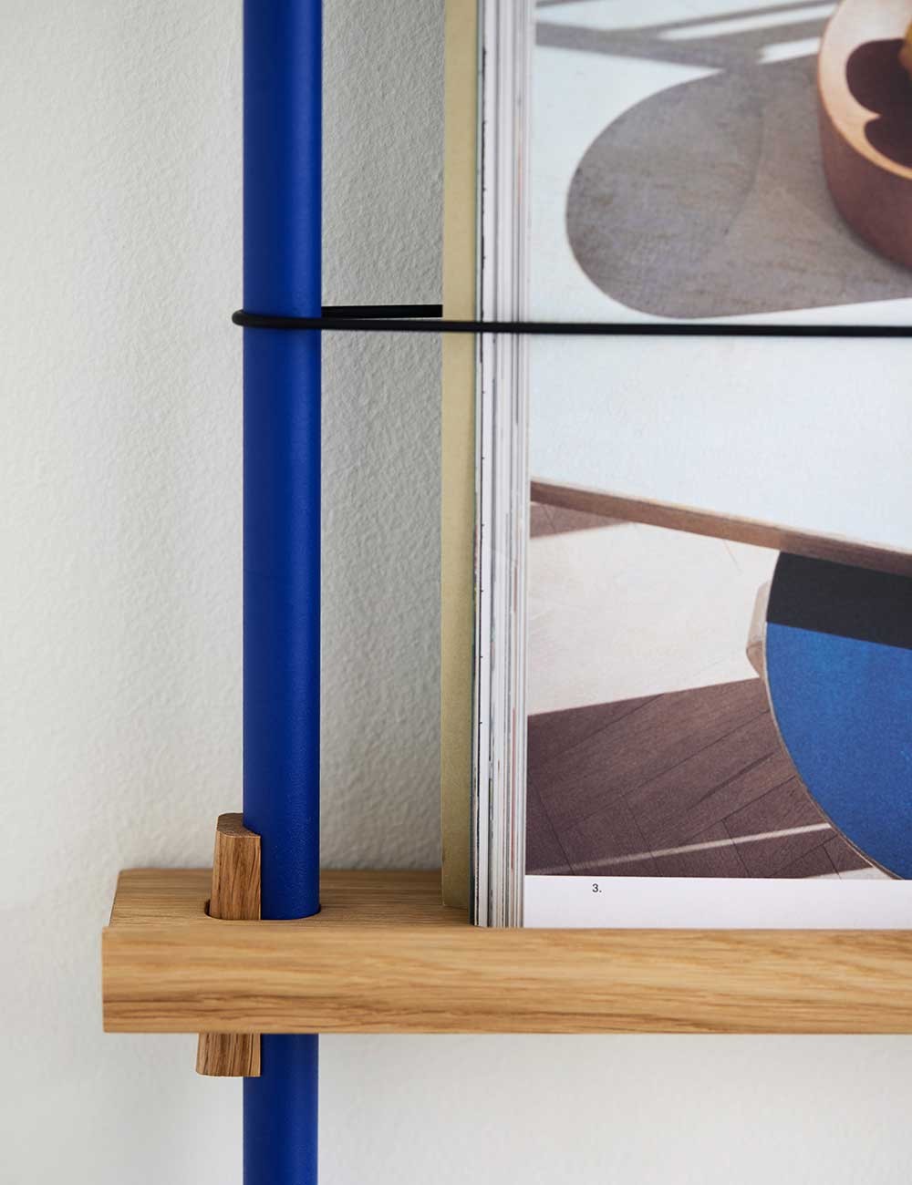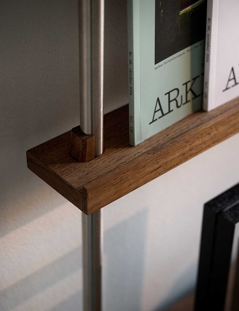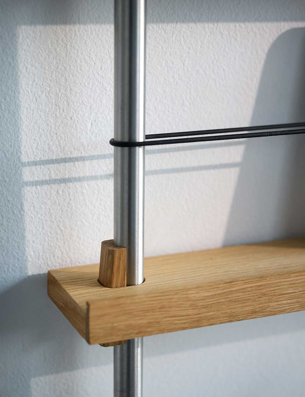 Chaque étagère ou module est soutenu par la structure métallique grâce à quatre cales en chêne massif.