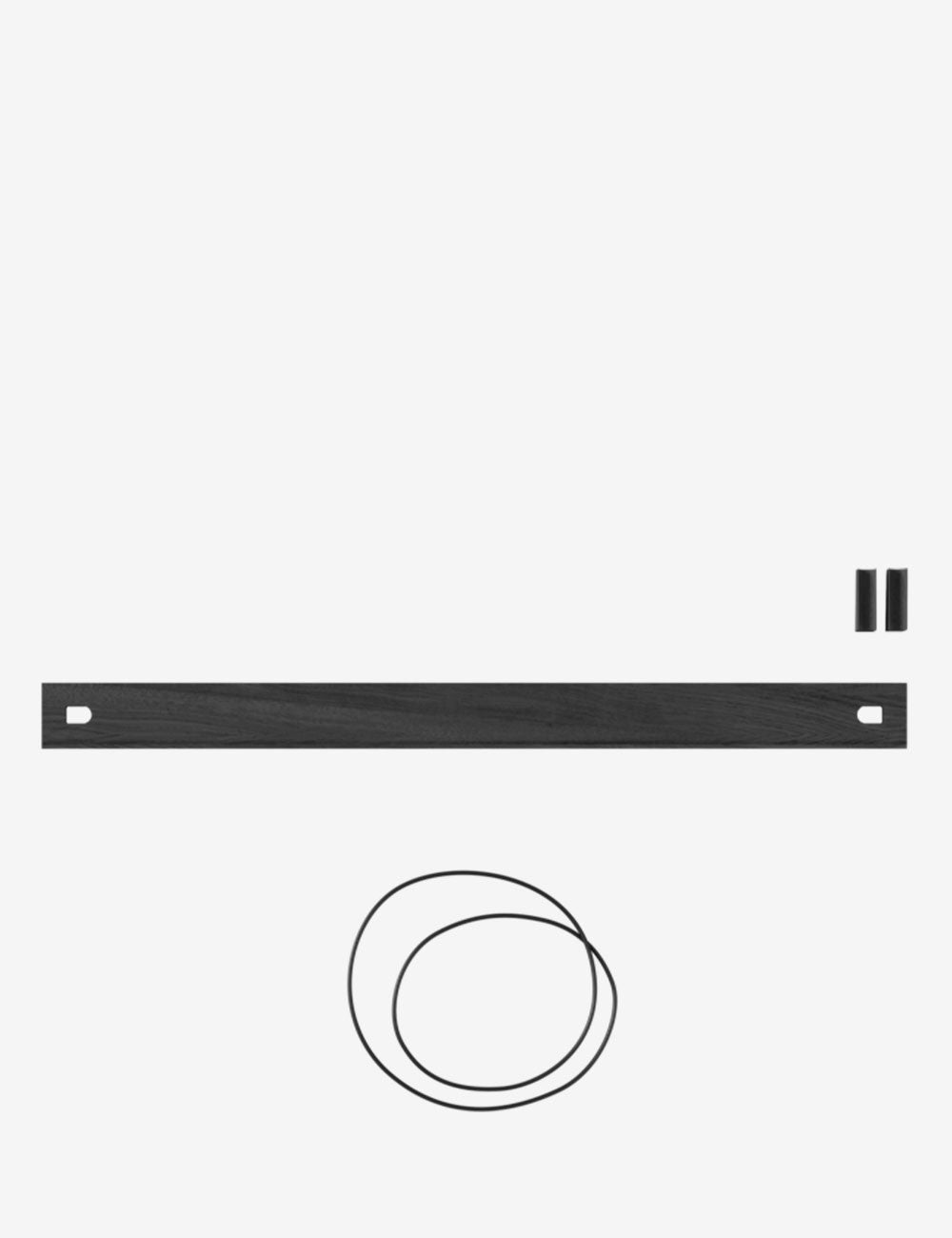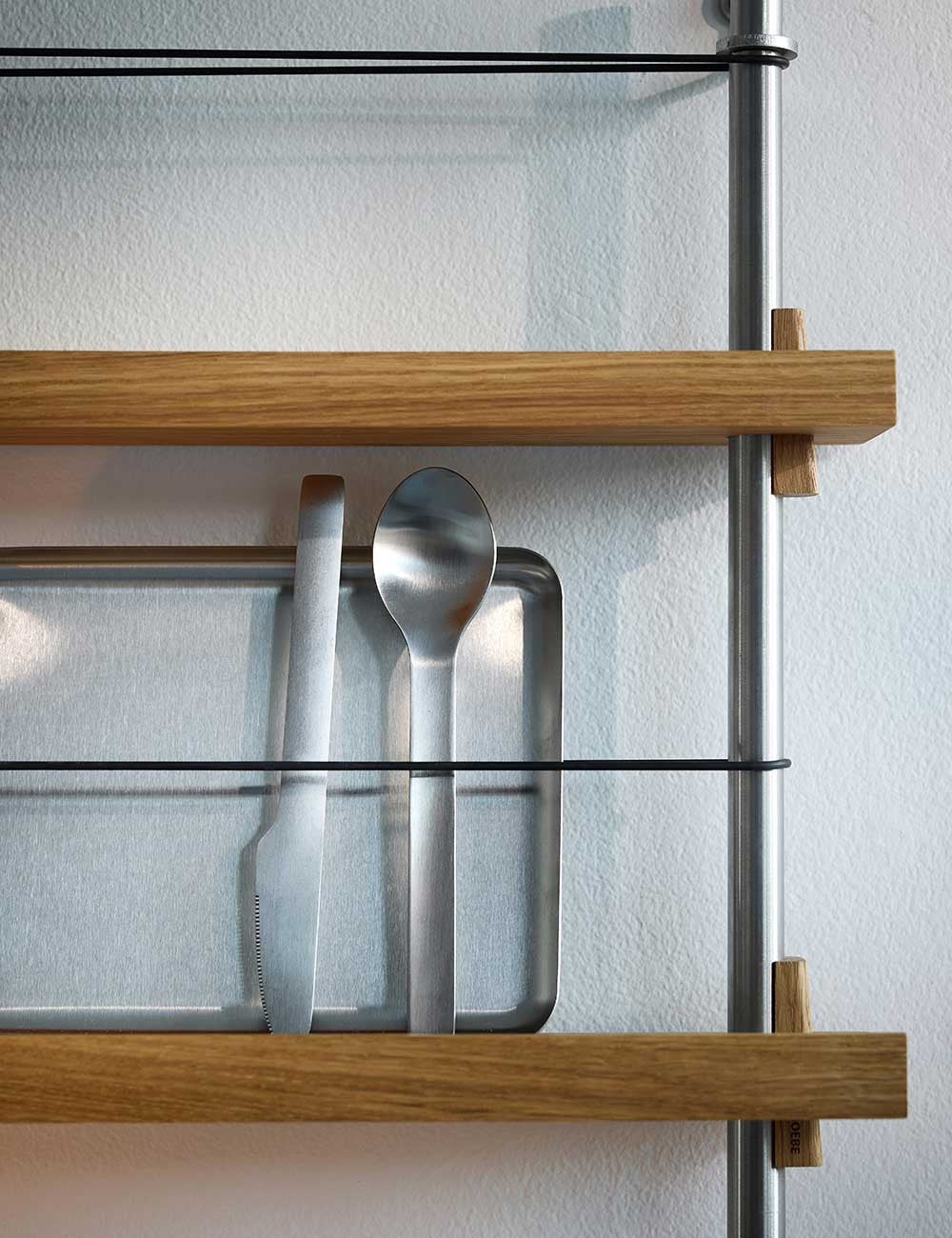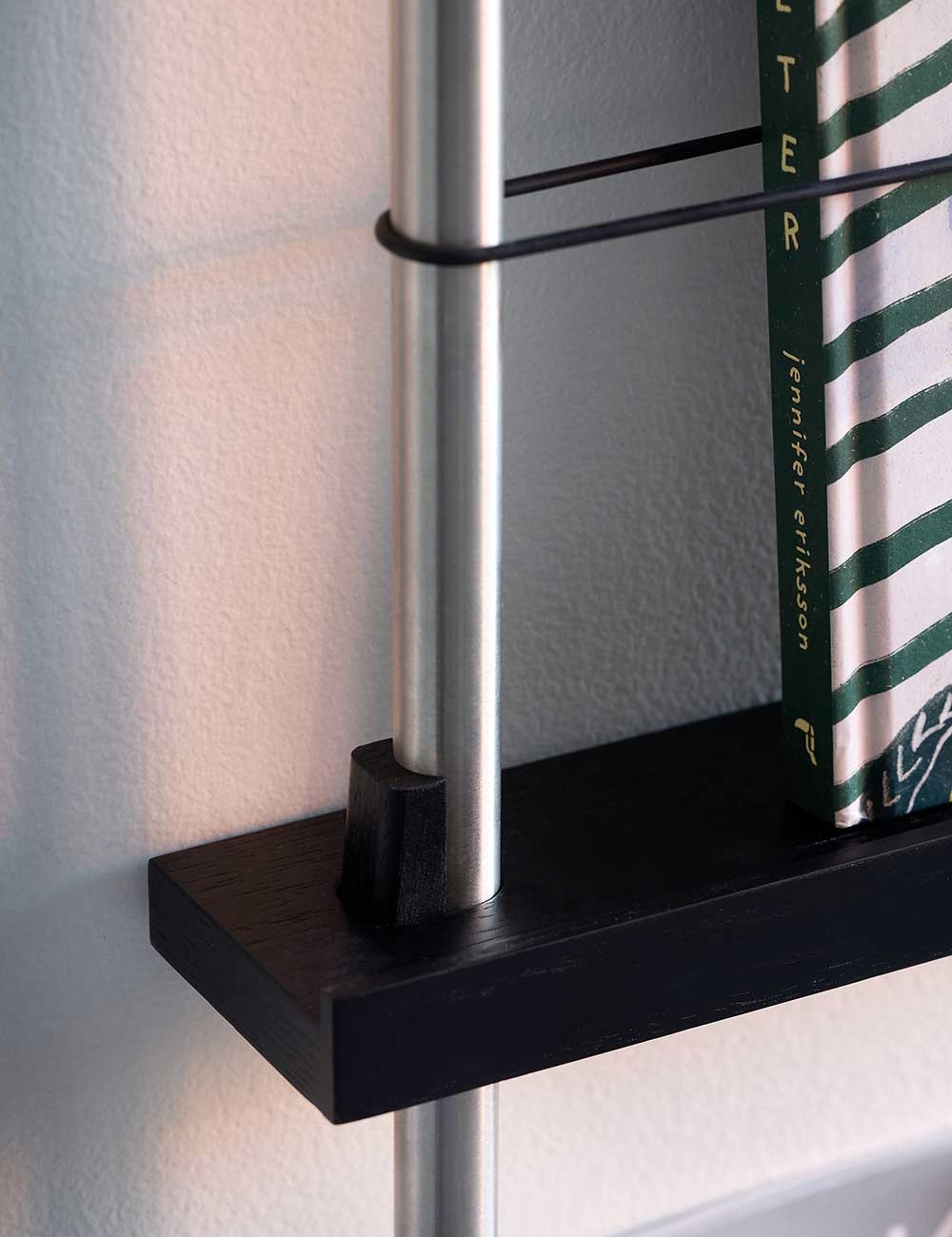 Chaque étagère ou module est soutenu par la structure métallique grâce à quatre cales en chêne massif.