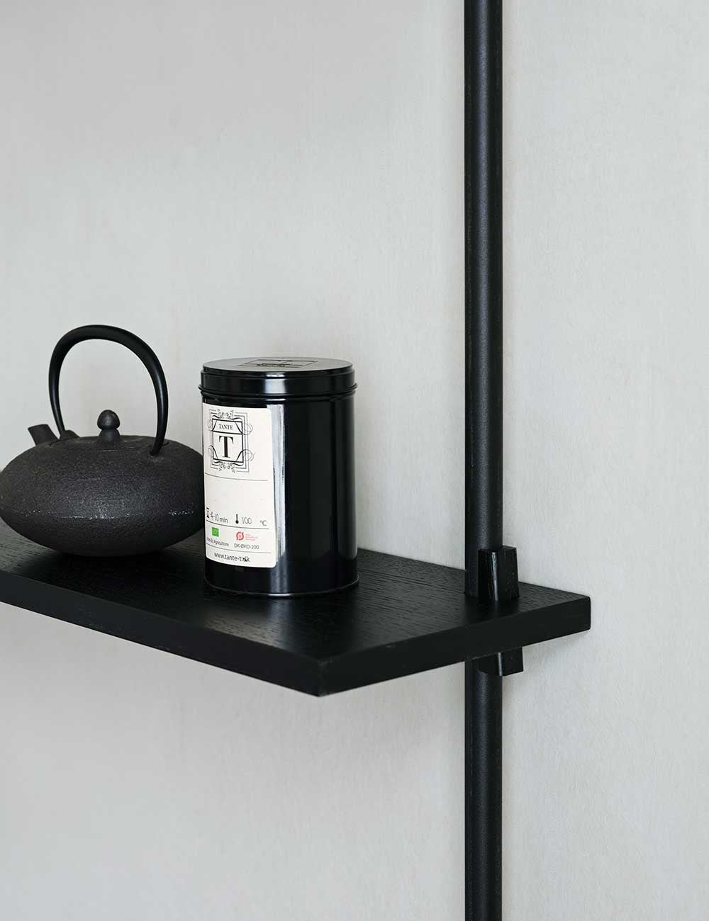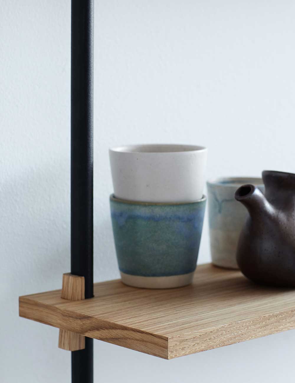 Chaque étagère ou module est soutenu par la structure métallique grâce à quatre cales en chêne massif.