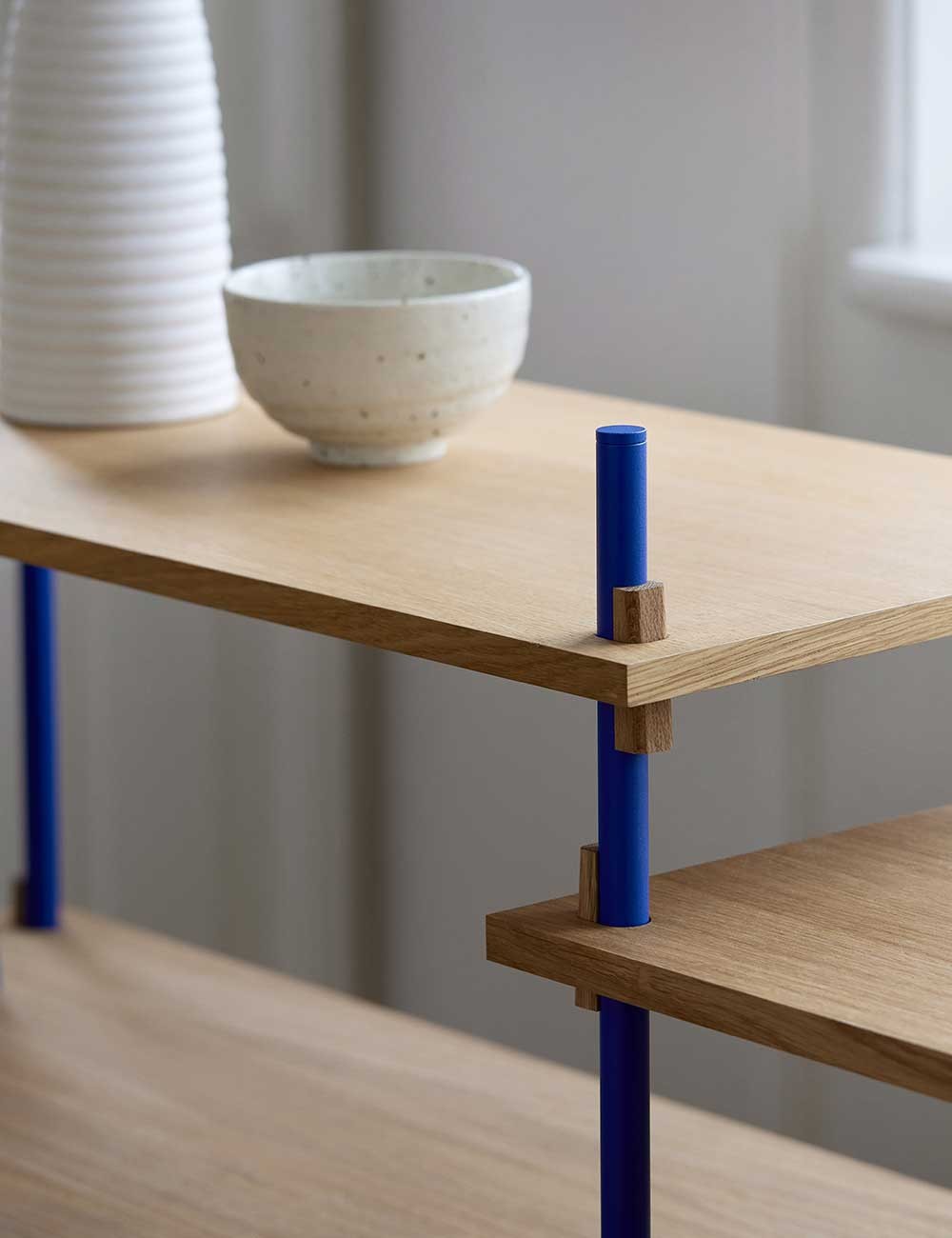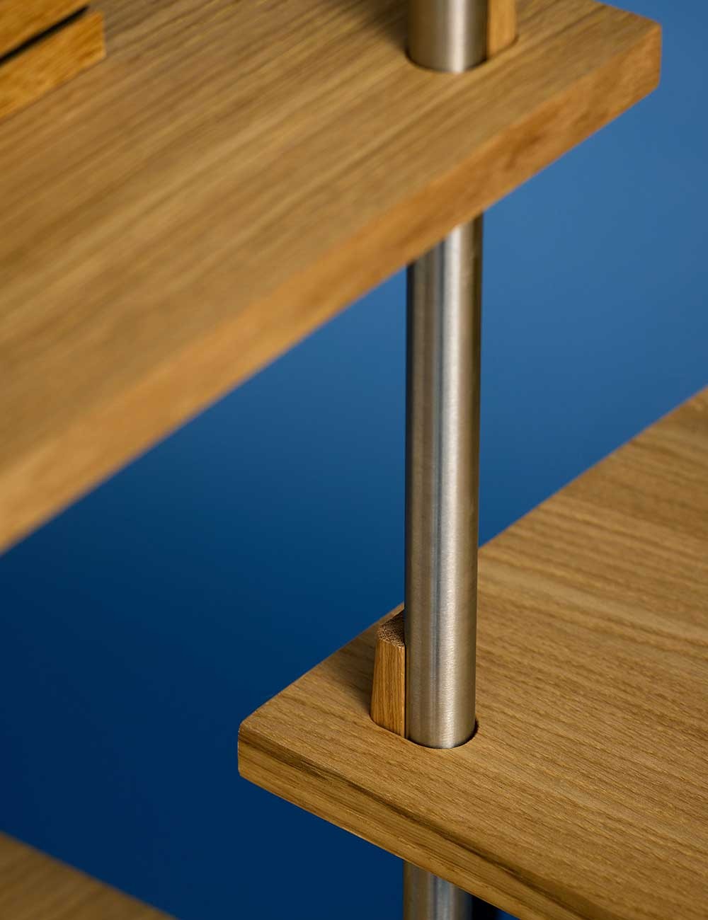 Chaque étagère ou module est soutenu par la structure métallique grâce à quatre cales en chêne massif.