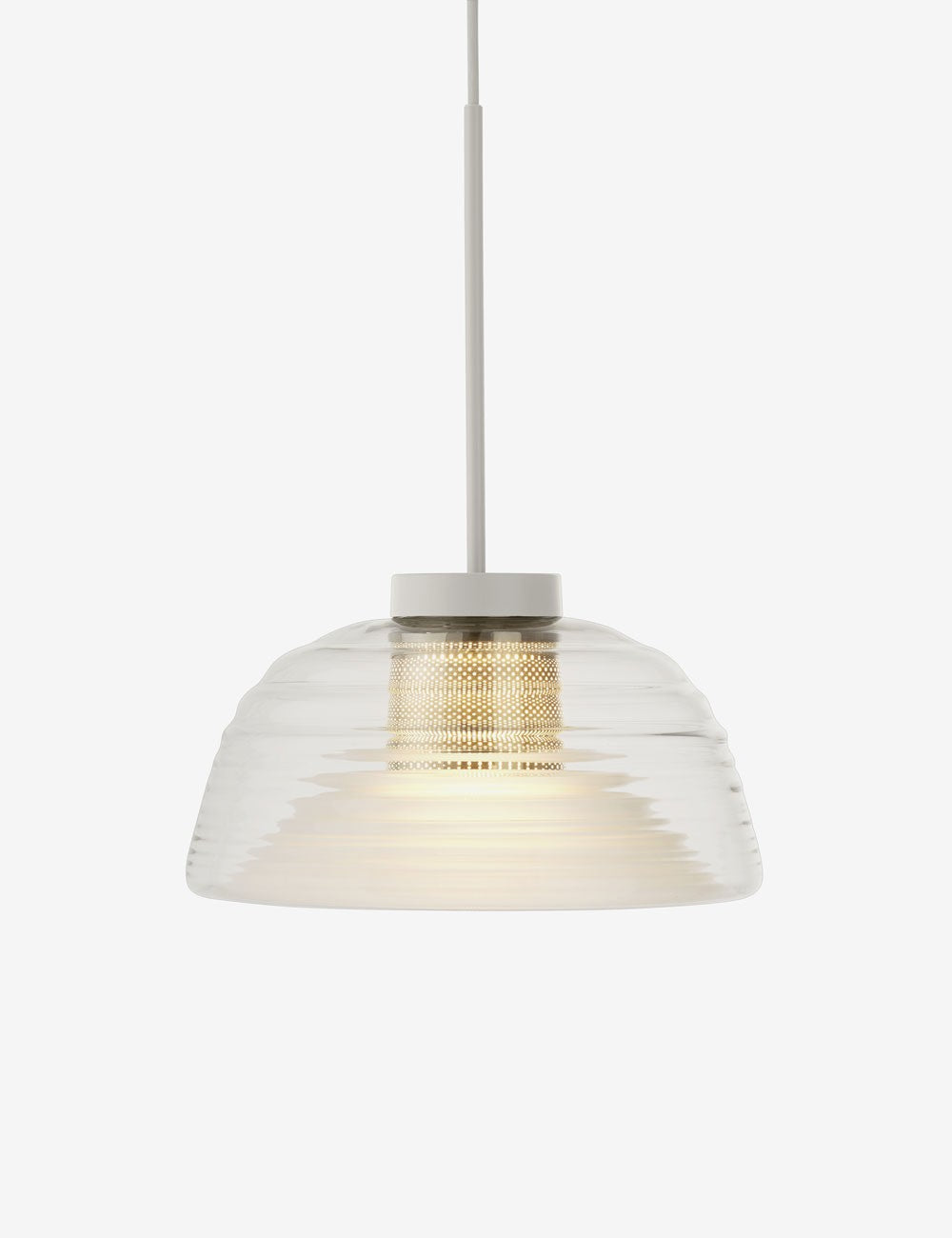 L'abat-jour en verre soufflé ondulé crée des effets optiques uniques sous différents angles. Ce design raffiné associe verre clair et verre dépoli à une maille en acier découpée, offrant une lumière abondante et non éblouissante.