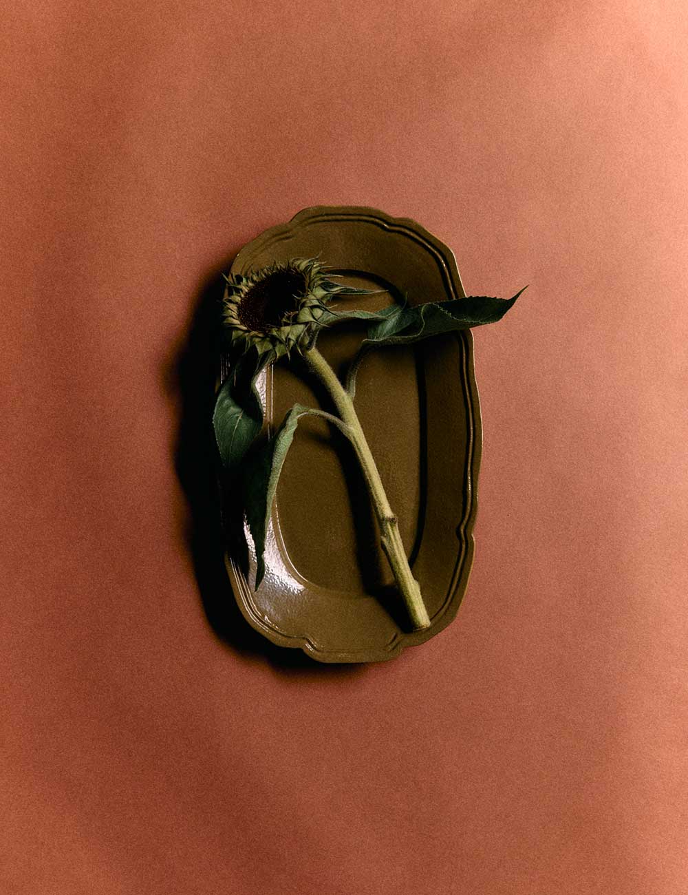 Plateau classique en métal vert olive qui revisite une silhouette intemporelle avec une touche contemporaine.