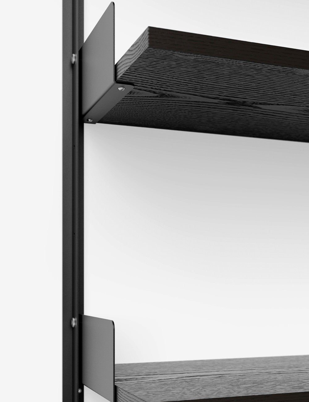 Les profils inclinés des étagères sont soigneusement assemblés avec des vis plates en acier inoxydable, ajoutant un détail honnête mais raffiné au design.
