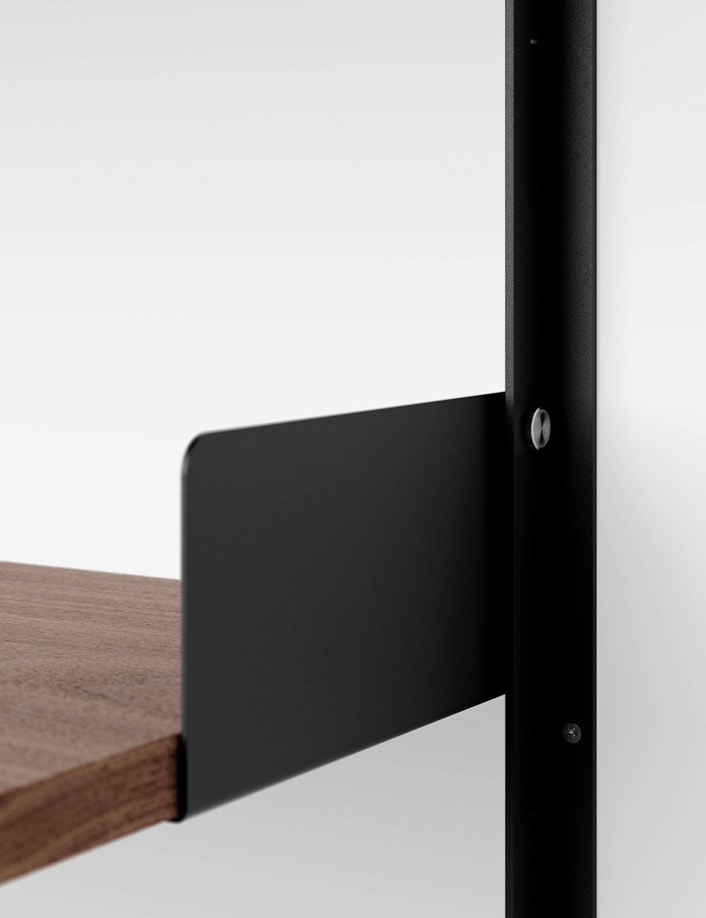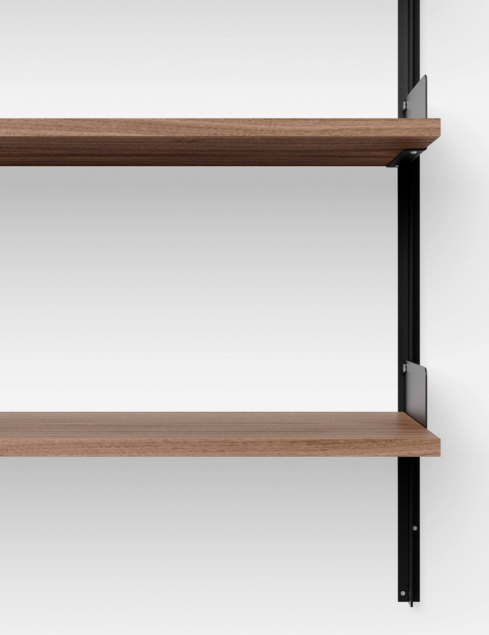 Le système d'étagères New Works est fabriqué en chêne, noyer, hêtre teinté noir ou MDF blanc, avec un cadre en acier et en fer.