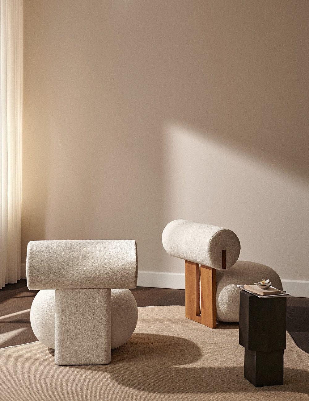 Les lignes arrondies et l'esthétique organique de l'assise et du dossier contrastent avec une structure linéaire, créant une pièce élégante mais visuellement légère.