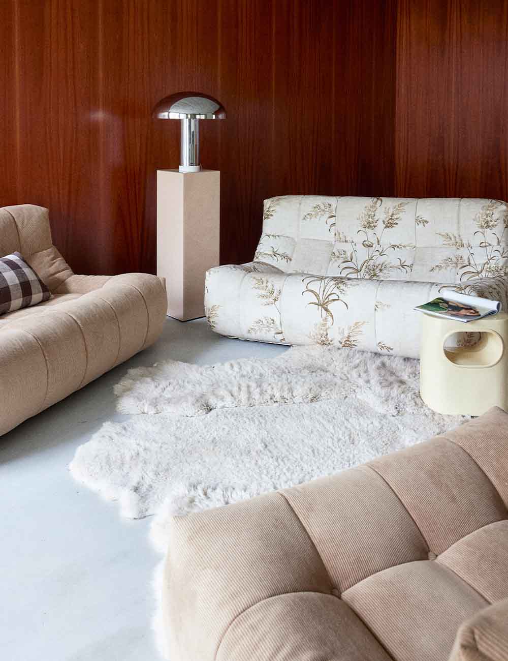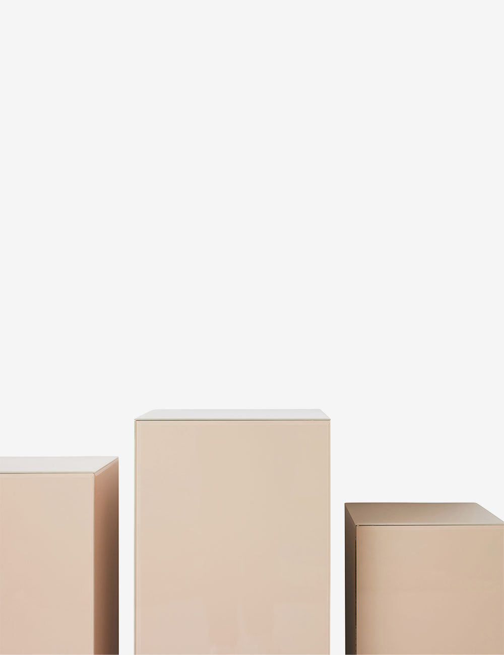 El sutil tono nude permite que el pedestal se integre con facilidad y potencie la presencia del objeto expuesto en la parte superior.