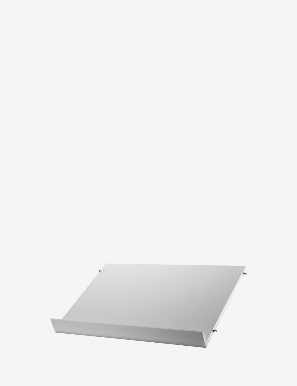 Le porte-revues est disponible en largeurs de 58 cm et 78 cm et s'adapte aux panneaux métalliques String System d'une profondeur de 30 cm.