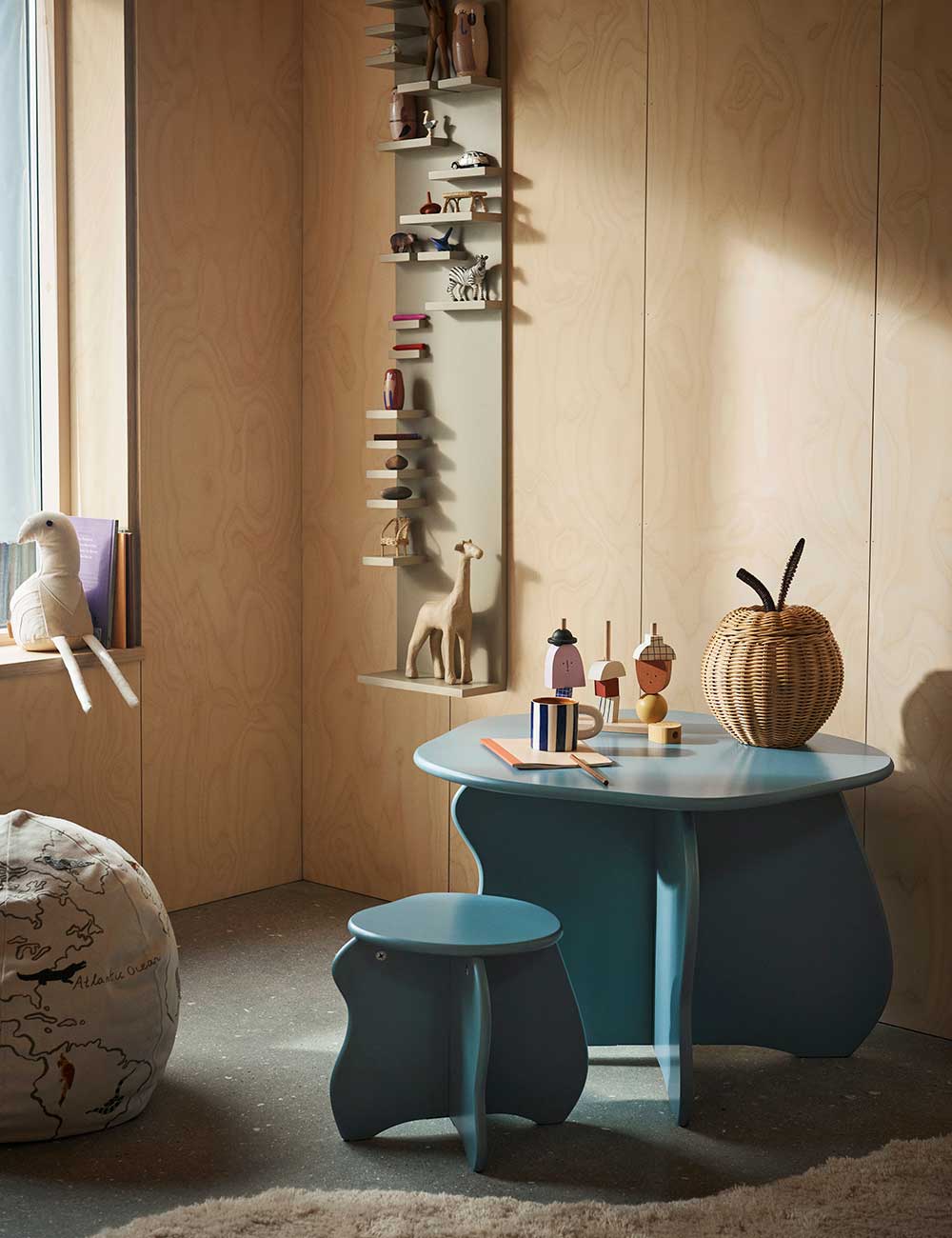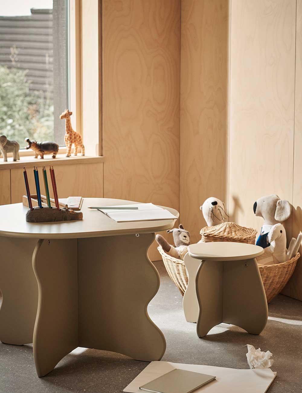 Cada elemento, ya sea taburete, mesa o banco con almacenaje, presenta formas distintivas y onduladas que invitan al juego y a la creatividad. Fabricados en MDF con certificación FSC™, estos muebles combinan funcionalidad y diseño decorativo, creando espacios acogedores y llenos de personalidad para los más pequeños.