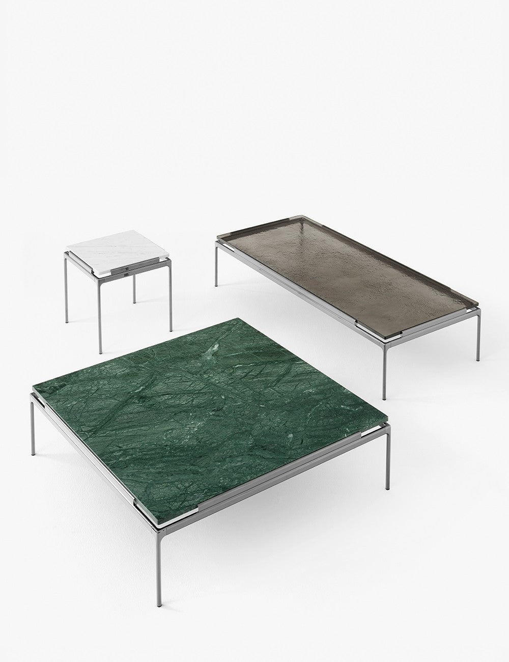 Vous pouvez trouver Sett dans différentes tailles avec un plateau en marbre Verde Guatemala, en marbre Bianco Carrara ou en verre fusionné.