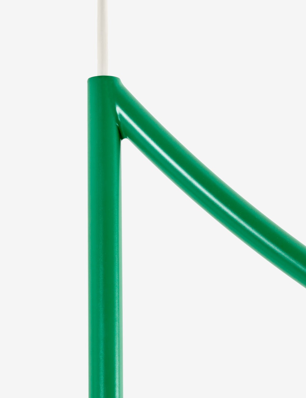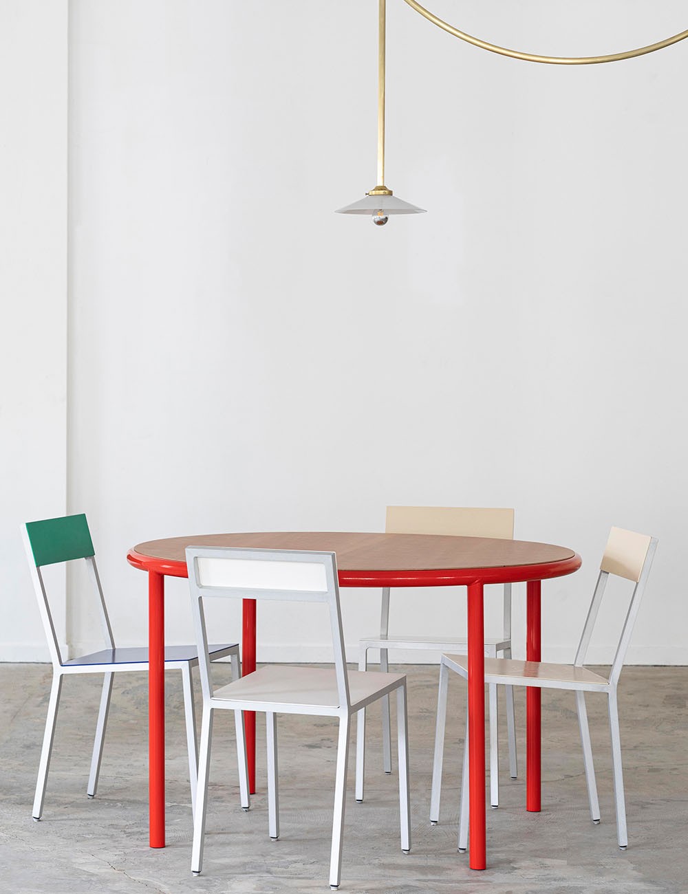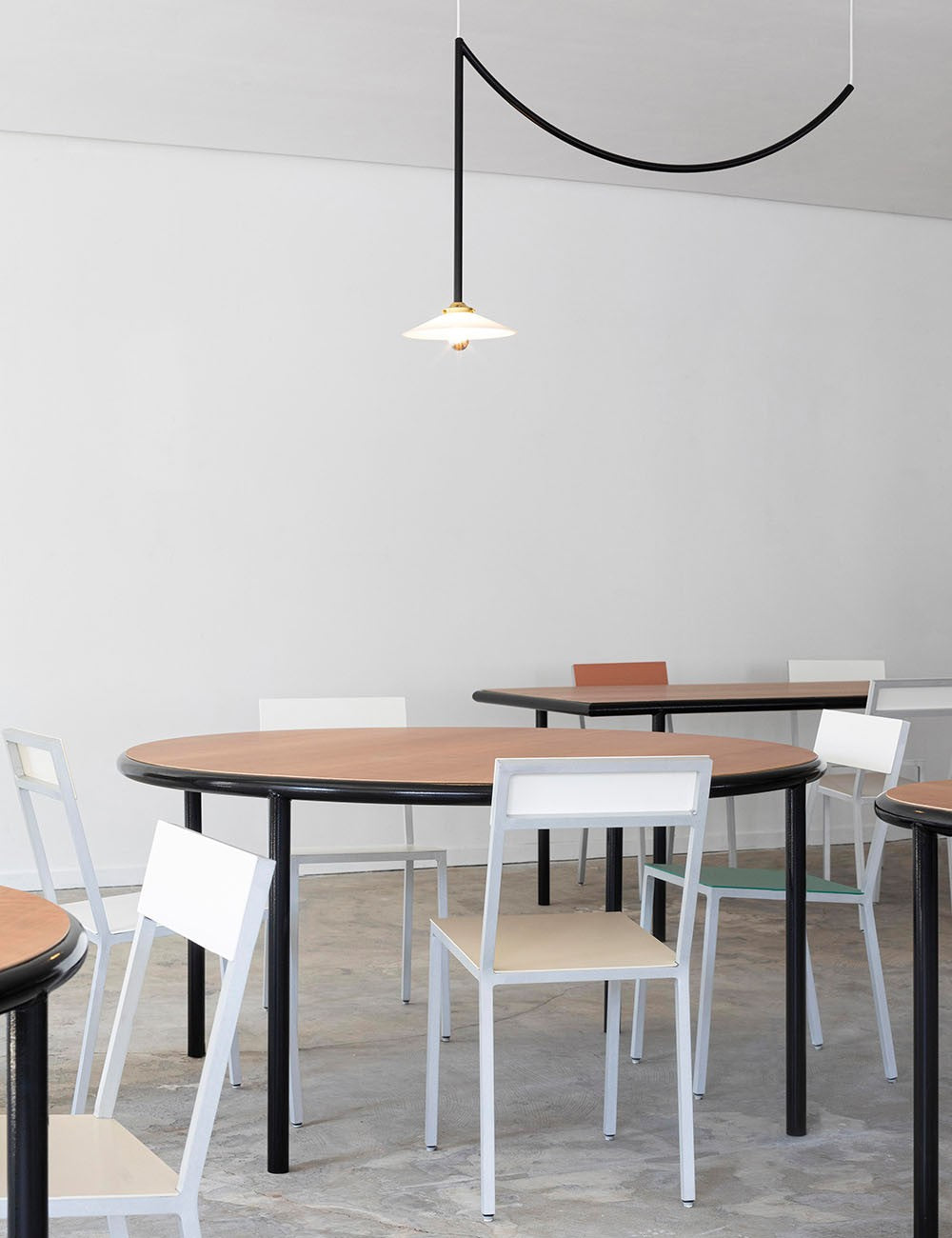 Comme tous les meubles de Muller Van Severen, les lampes apportent une touche sobre et colorée à l'intérieur. Au bout de cette ligne se trouve une ampoule, avec un abat-jour déniché dans une brocante.