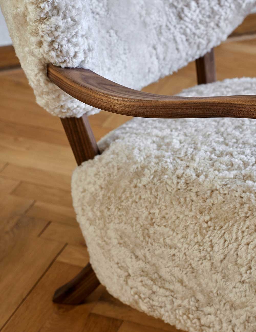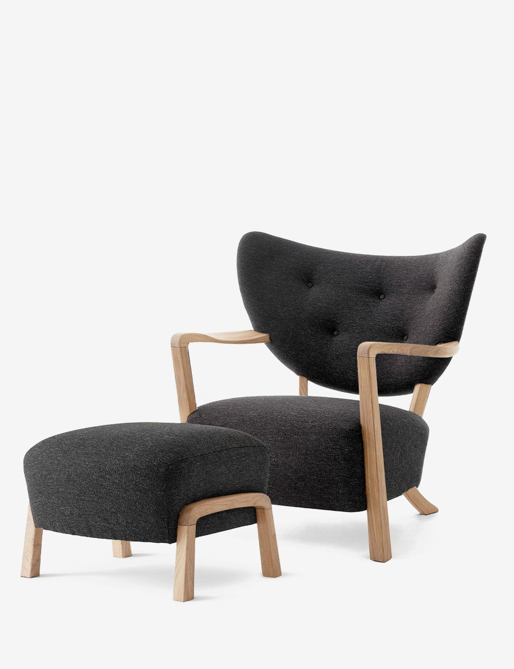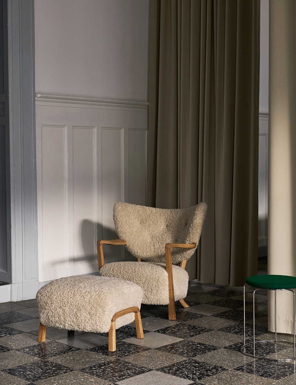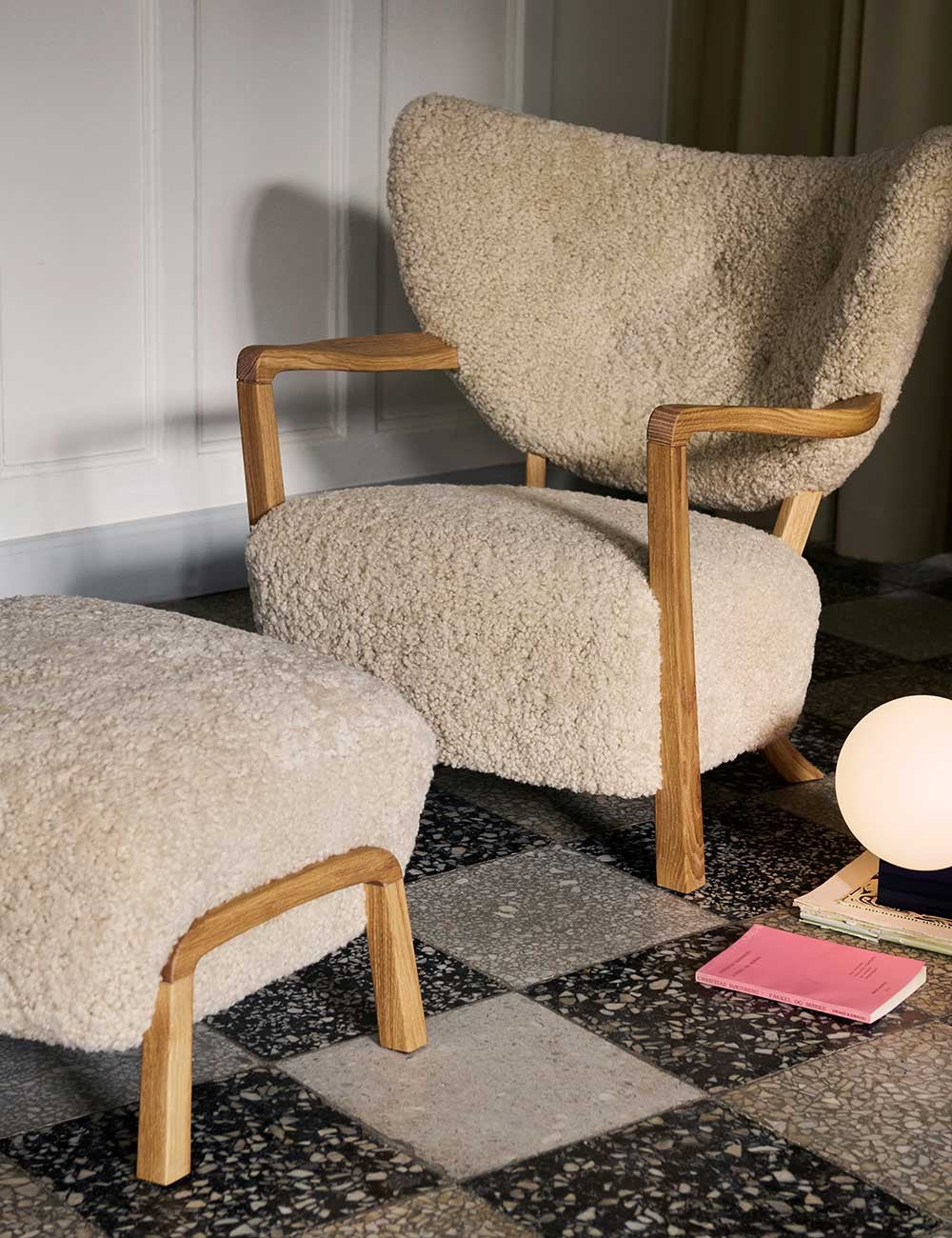 L'ensemble est complété par le pouf Wulff, fabriqué artisanalement avec des pieds en chêne ou en noyer massif et disponible dans le même revêtement exclusif que le fauteuil. Idéal comme repose-pieds ou siège d'appoint, il offre un confort et une détente optimaux.