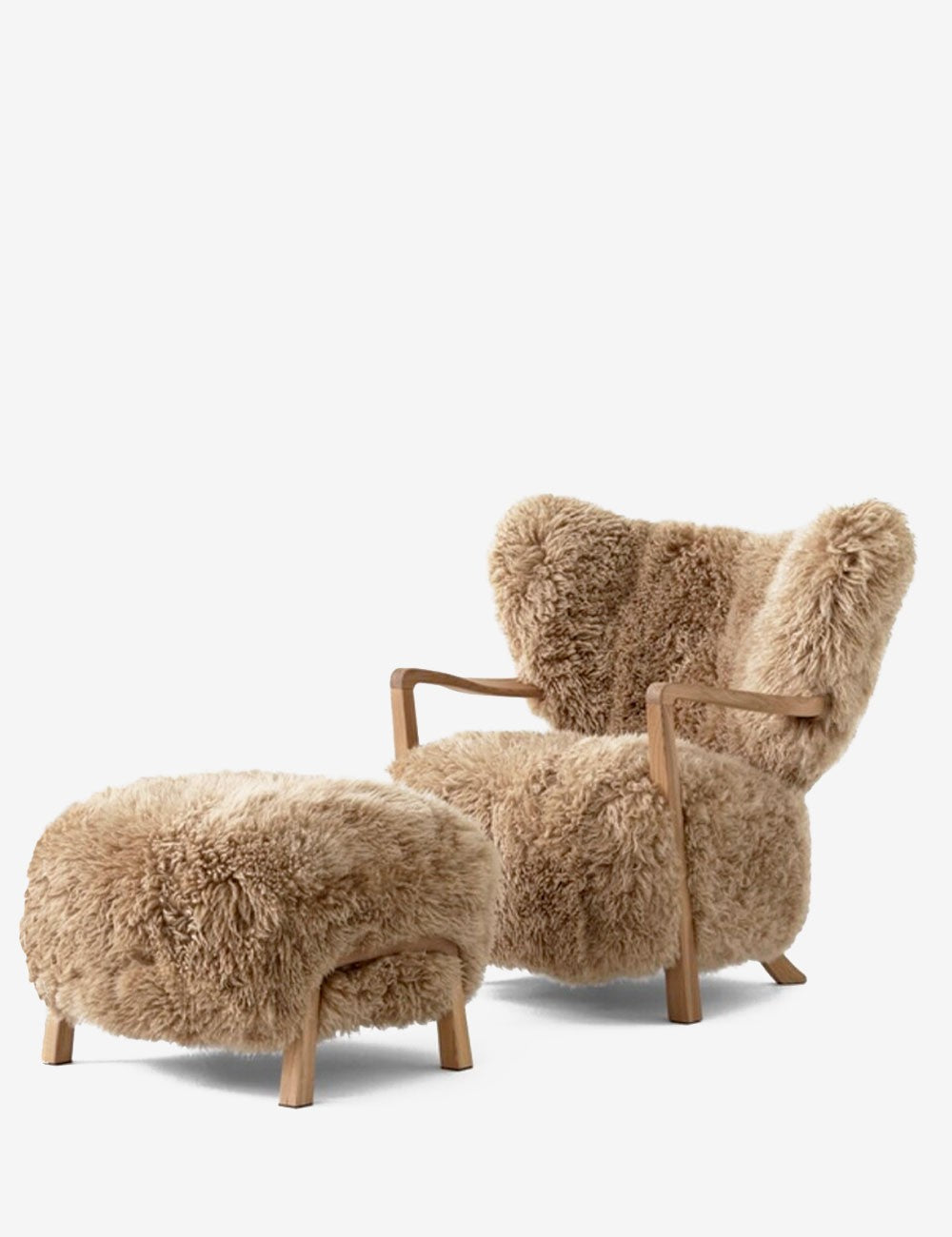 L'ensemble est complété par le pouf Wulff, fabriqué artisanalement avec des pieds en chêne ou en noyer massif et disponible dans le même revêtement exclusif que le fauteuil. Idéal comme repose-pieds ou siège d'appoint, il offre un confort et une détente optimaux.