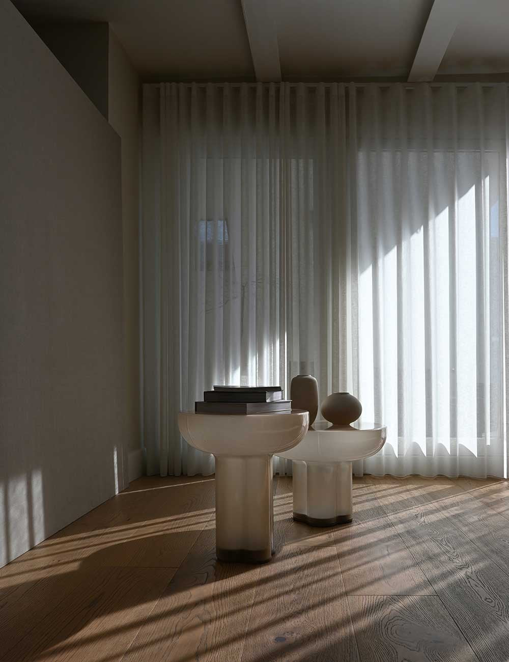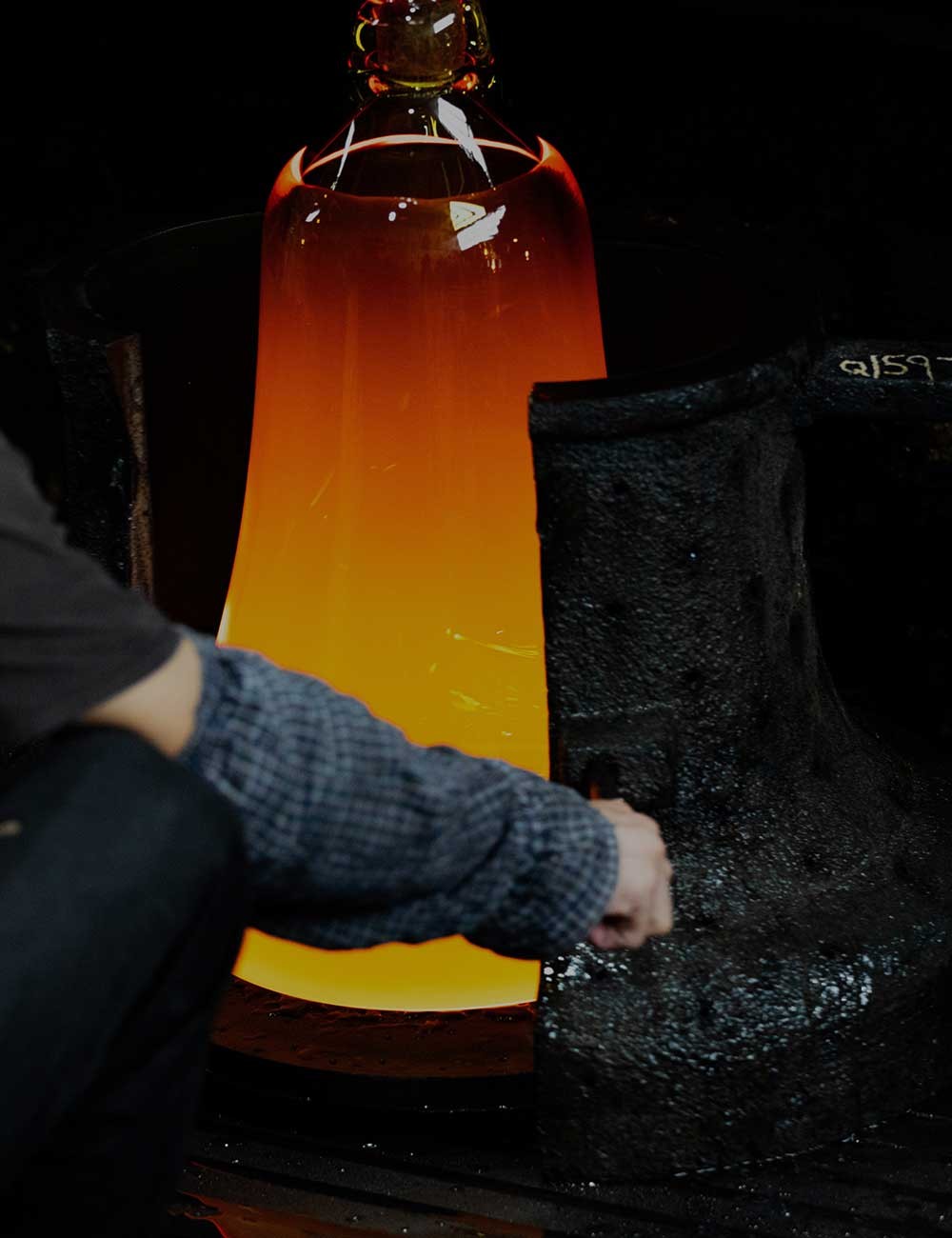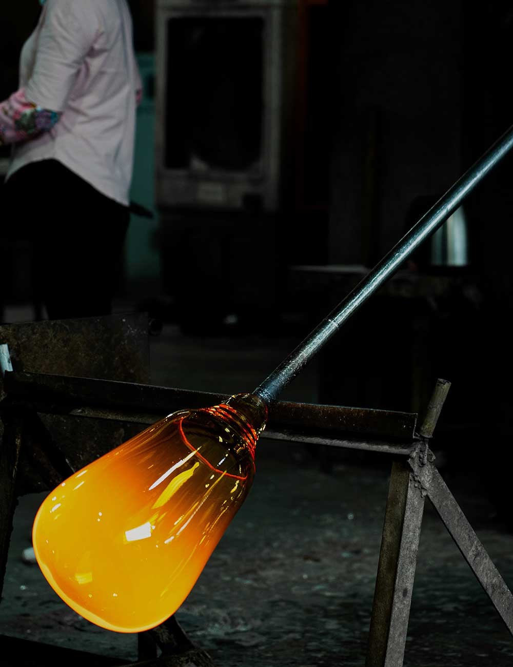 Realizzato in vetro soffiato a bocca e riscaldato a 1.500 gradi, il tavolo viene modellato in uno stampo personalizzato prima di essere temprato per garantirne la resistenza. Viene quindi montato su una robusta base in legno con supporto interno in metallo, che ne garantisce stabilità e durata.