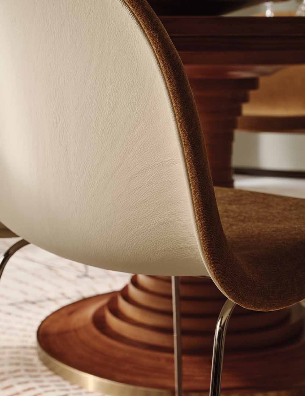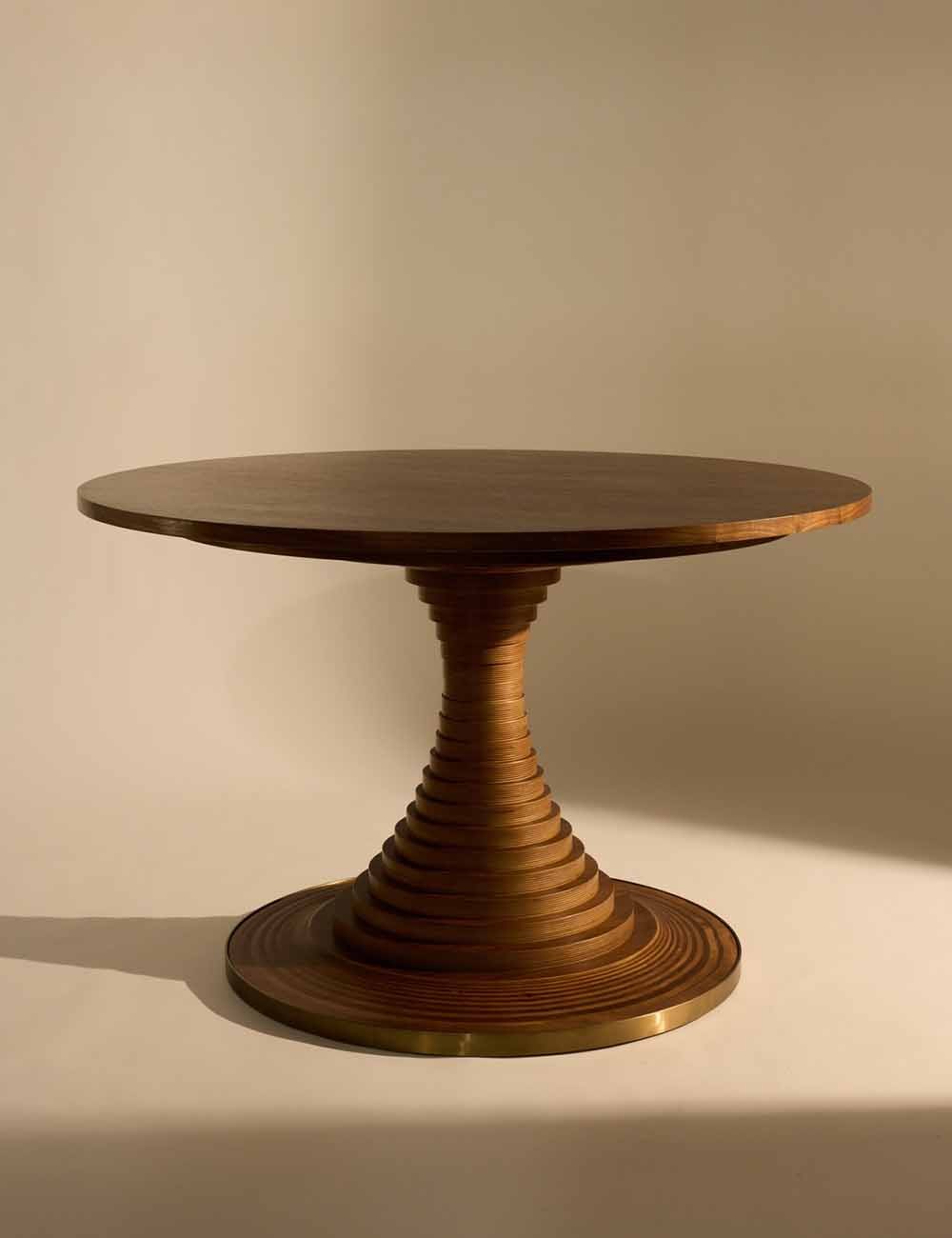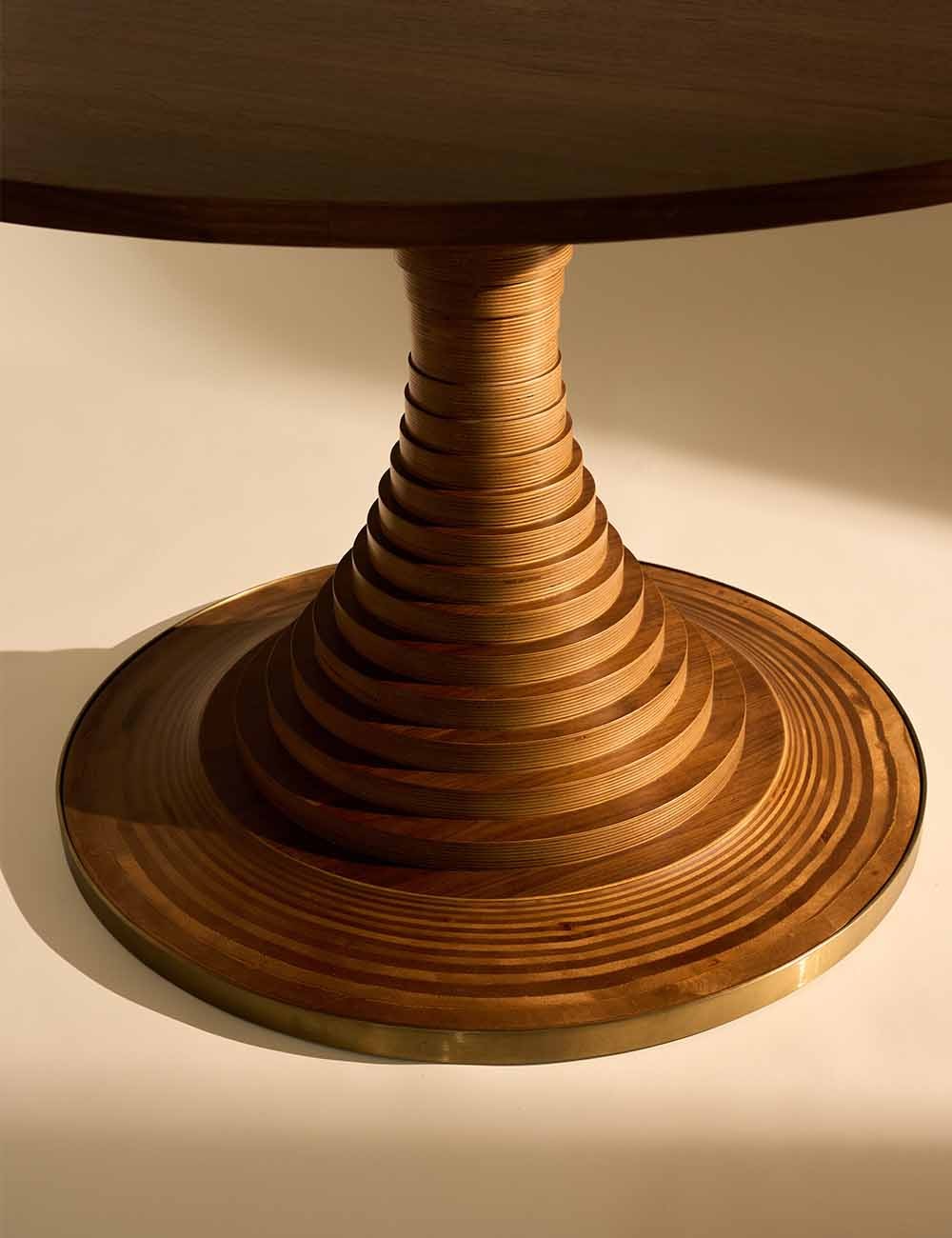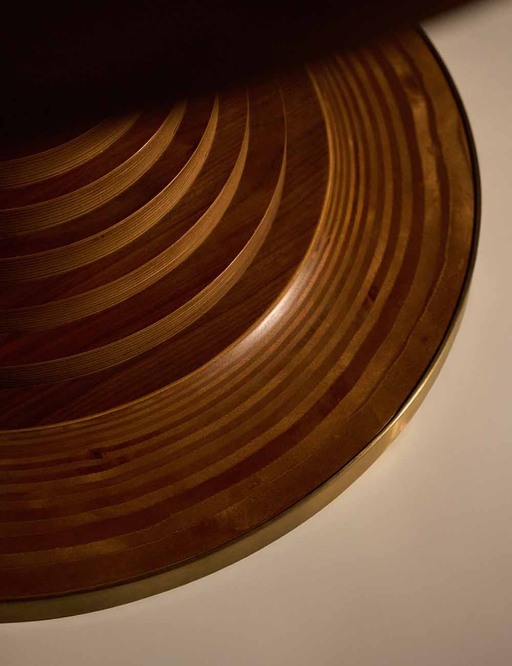 I dischi, di diametro variabile, sono impilati attorno a un'anima metallica nascosta, formando un'elegante curva che sostiene l'ampio piano del tavolo. Una fascia in acciaio color ottone brunito alla base aggiunge contrasto e protegge.