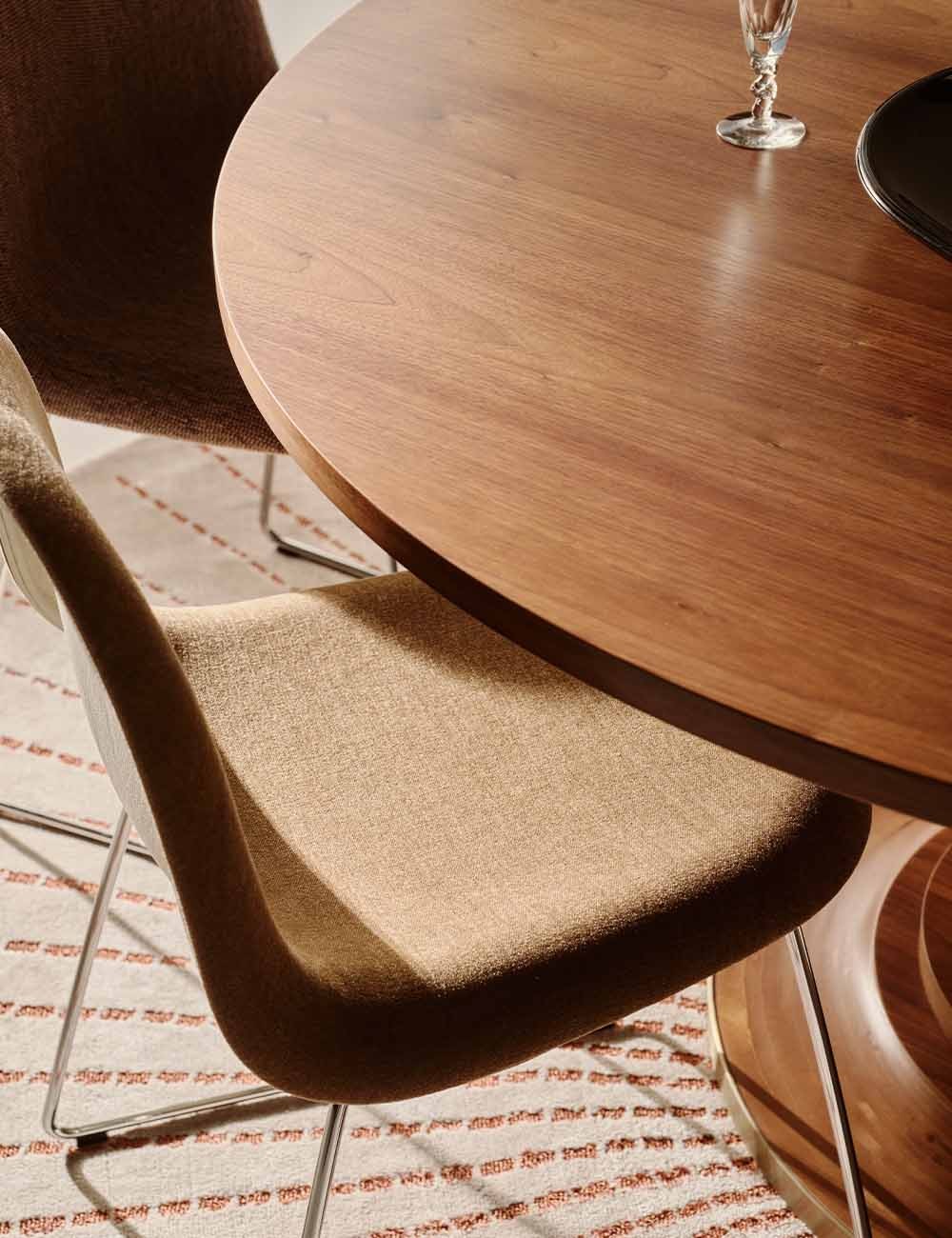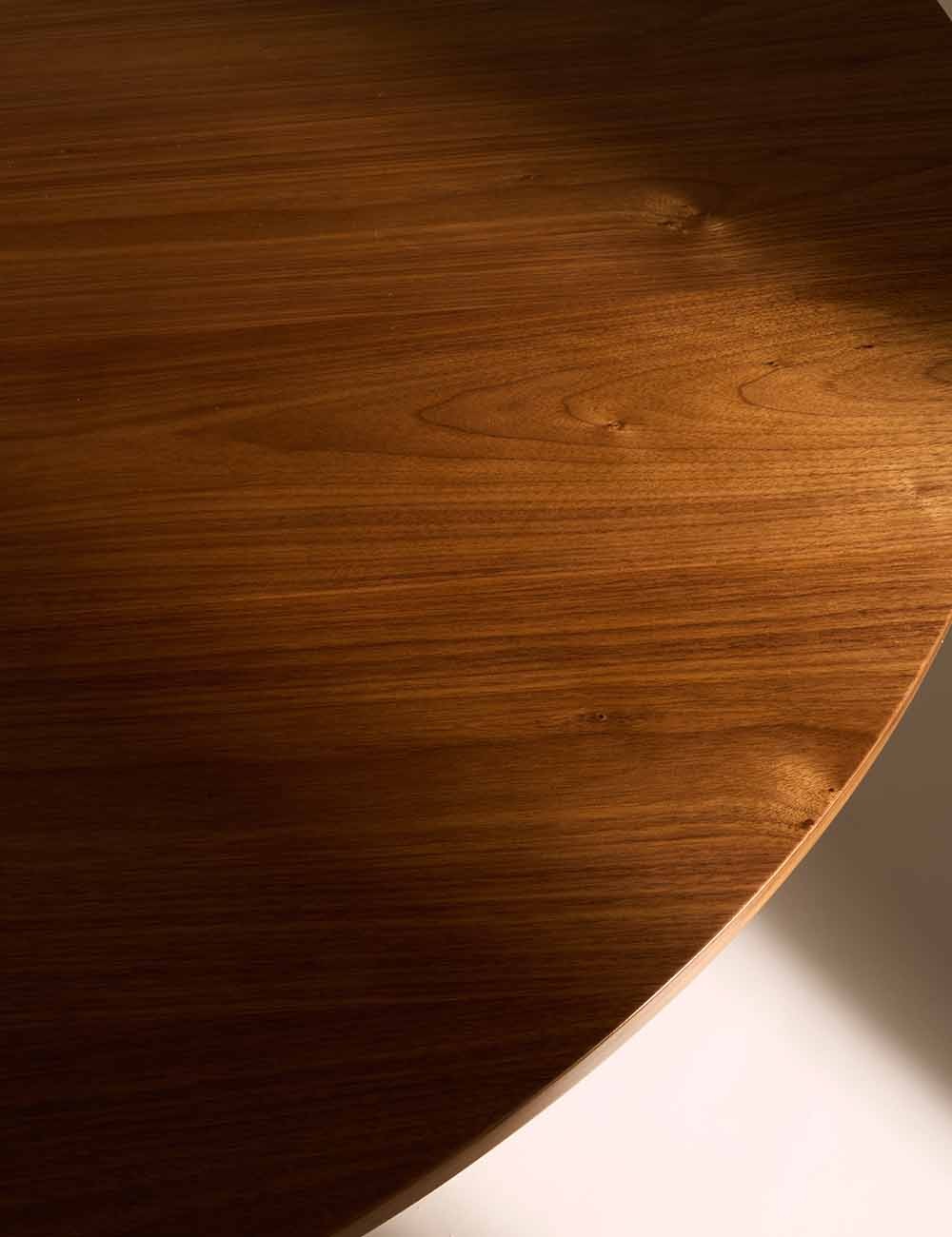 Il tavolo rotondo è sapientemente costruito con dischi in compensato di betulla e impiallacciatura di noce spessi 3 cm e un piano del tavolo impiallacciato in noce abbinato, il tutto realizzato con legno certificato FSC® e legno proveniente da altre fonti responsabili (FSC® C176589).