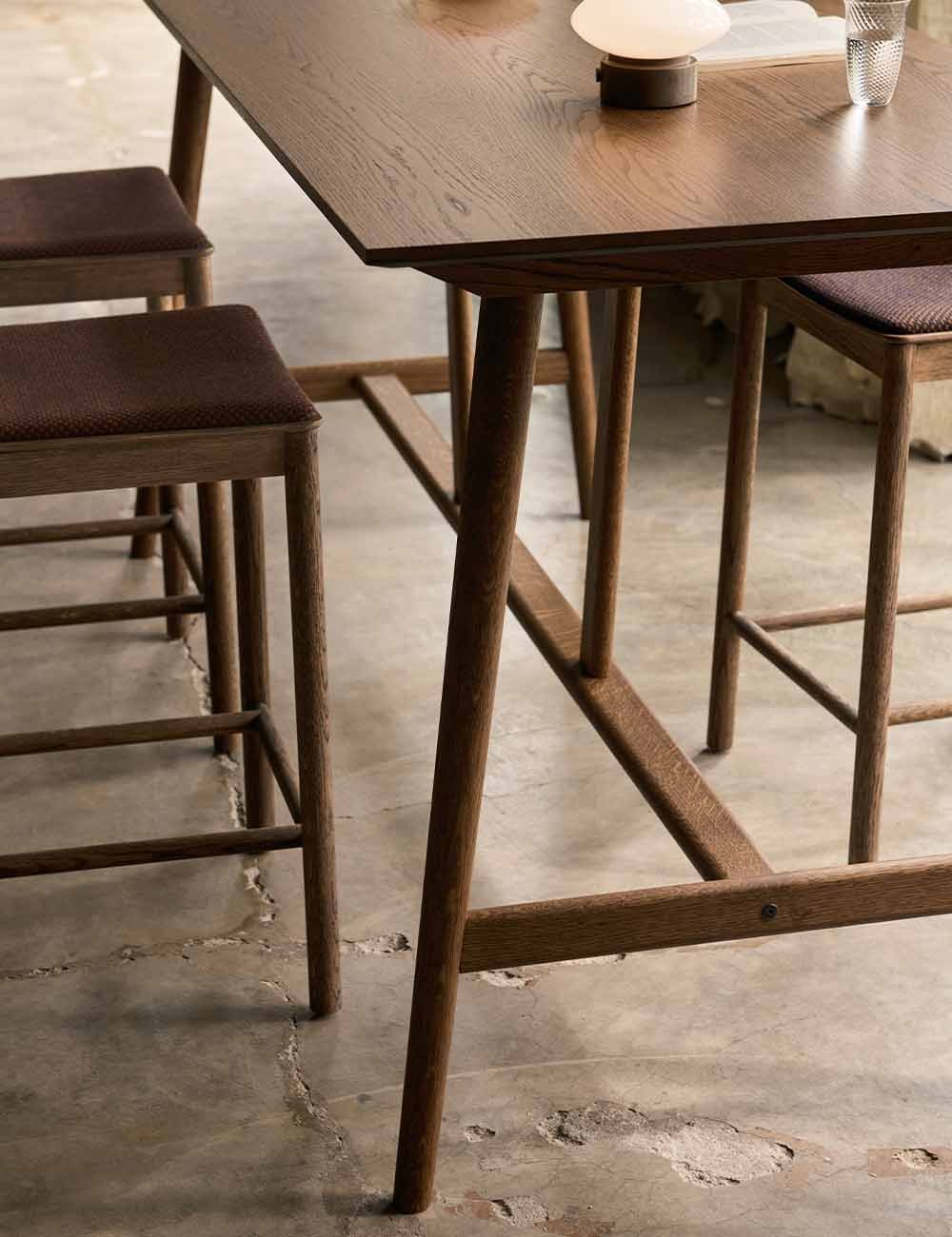 Il piano e i bordi sono realizzati in impiallacciato di rovere, mentre le gambe sono in legno massello, garantendo durevolezza e naturalezza in ogni dettaglio.