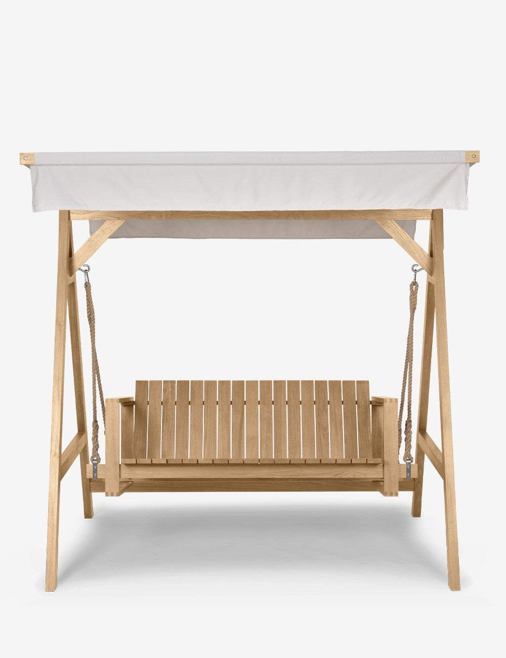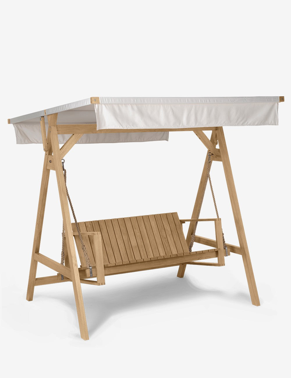 A-Frame è progettato specificamente per sostenere il divano BK13; come il resto della collezione, è realizzato in teak massello e include un baldacchino in tessuto Sumbrella resistente all'acqua.